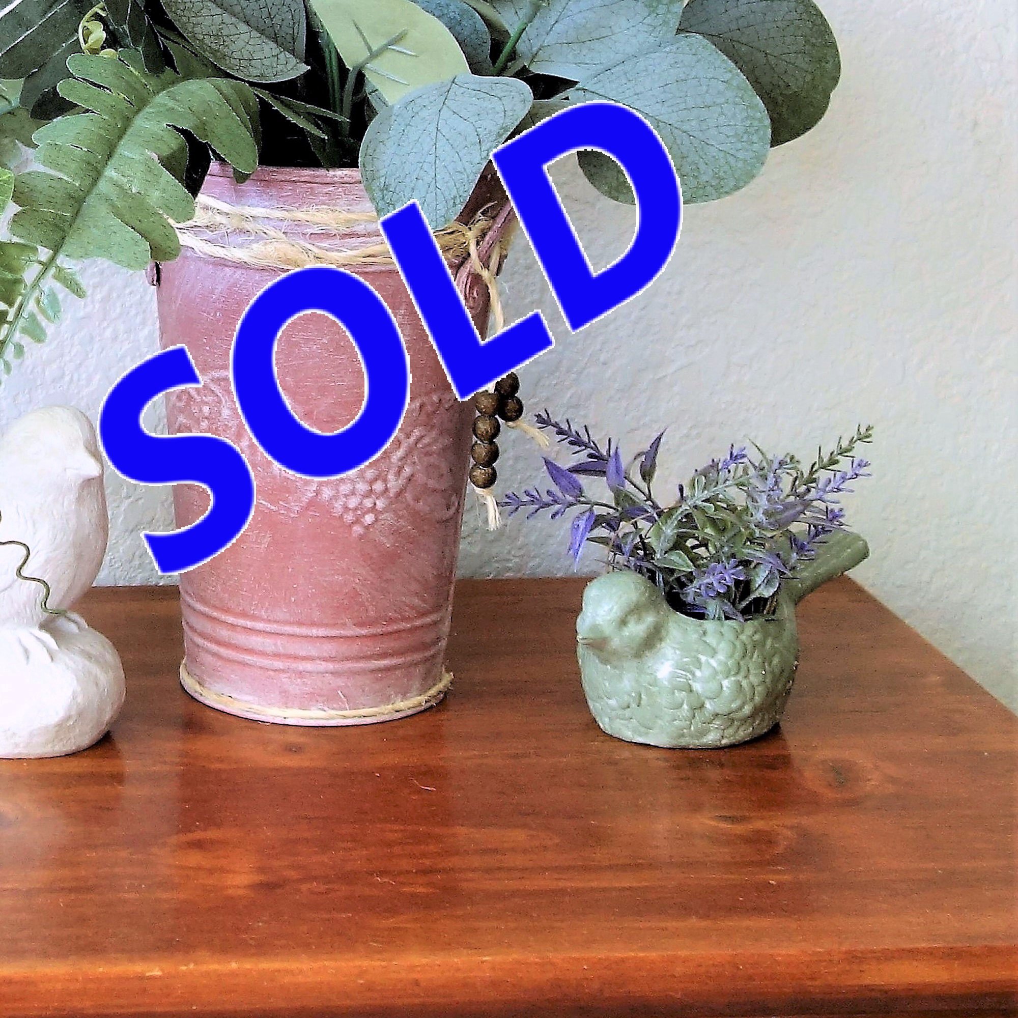 When I spotted this little white bird votive I all could see was cottagecore! So I rescued him and gave him a beautiful sage green color with a white wax over-brush to bring out his details. I like the pop of the dark greenery in the lavender florals - it made a nice contrast, a little different from just dropping a tealight candle inside. The lavender floral and my very own dust-free, hypoallergenic floral filler is included with this little bird votive, but it can be easily removed if you would like to add a tealight candle as a change. Bird measures 5 inches across, 2-1/4 inches tall, 2-1/2 inches deep.