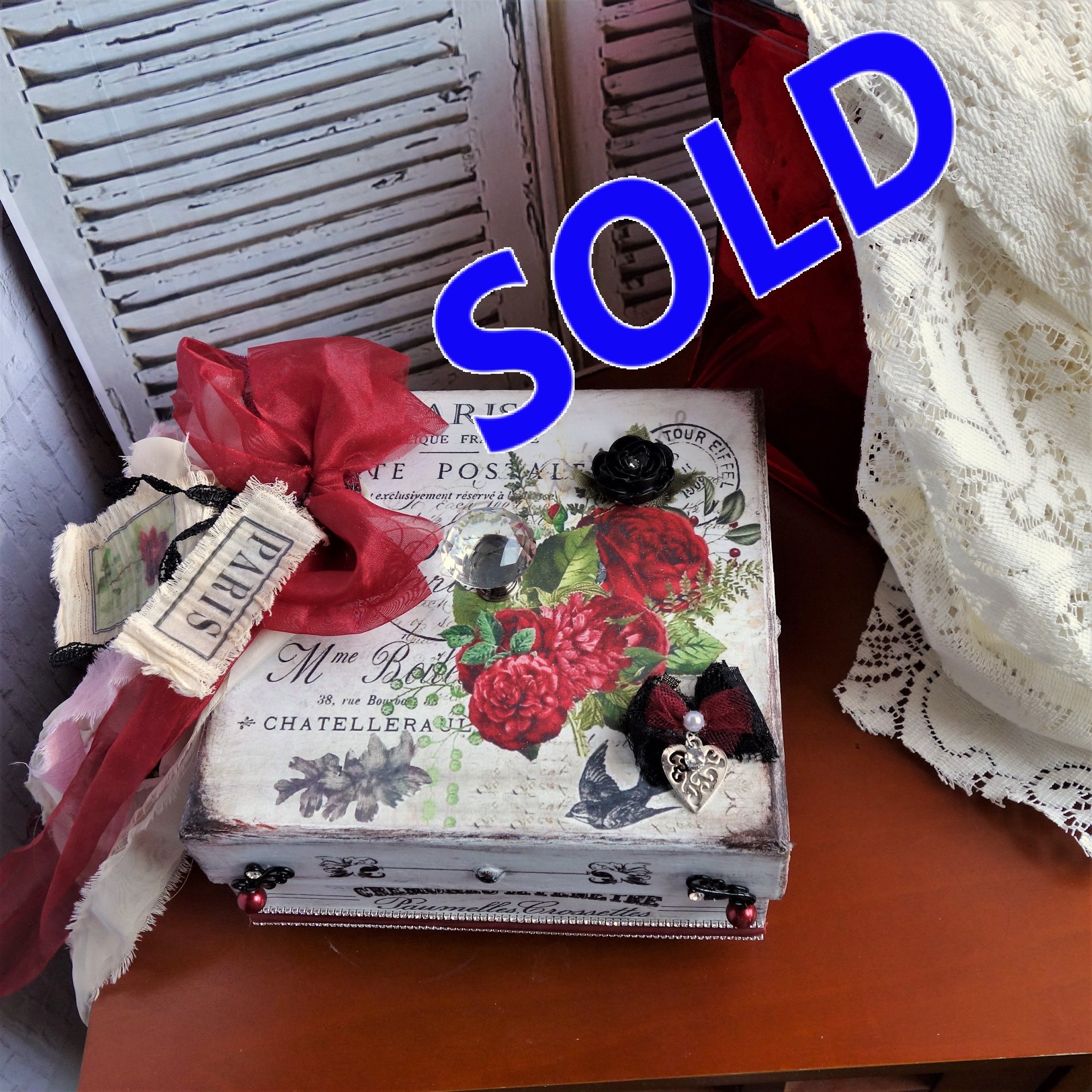 Chiffon cream base color distressed to give the appearance of age. Premium crystal knob handle, Swarovski (R) brand black rose charm with crystal center; finished with rose floral images, vintage French chic labels, embellished with vintage style lace and fabrics, charm accents, handmade vintage rose and fabric tags. Antique red color finishing paper inside with vintage style pattern.
