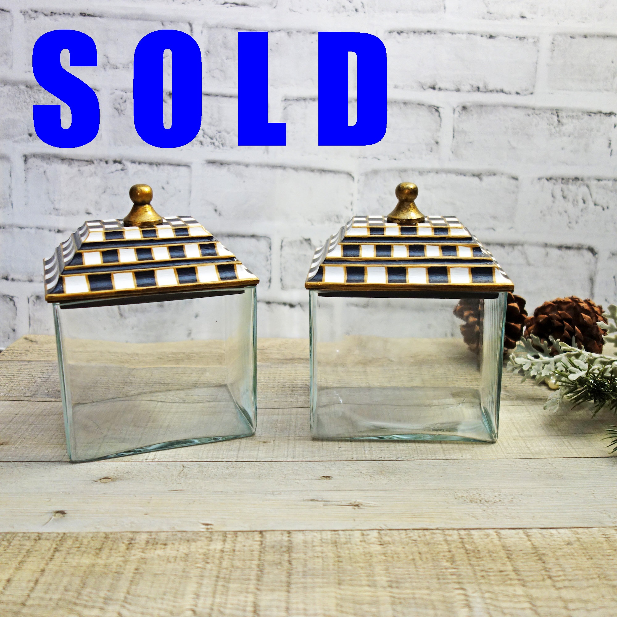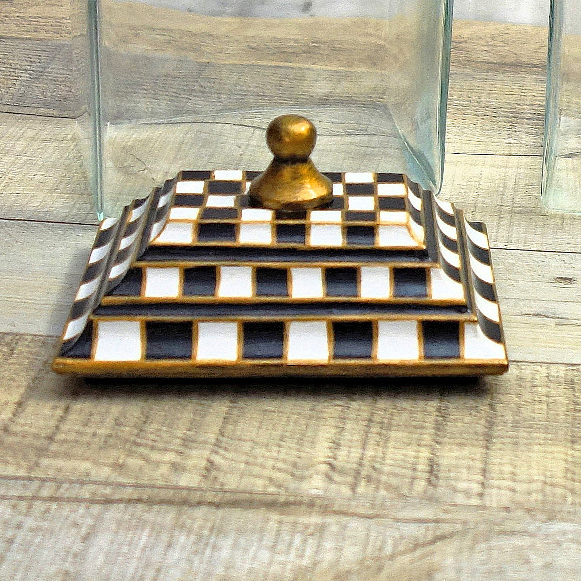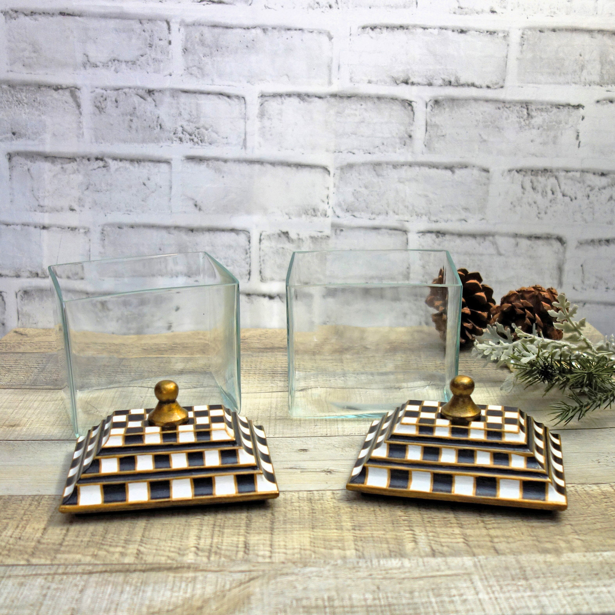 ARTISAN DETAILS The centerpiece of this rescue is the transformation of the solid bronze lids. I have hand-rendered my signature black and white checkered pattern across the metal surface, creating a bold, graphic contrast to the industrial warmth of the bronze. The thick, heavy-walled glass remains unpainted to showcase its beautiful vintage clarity and substantial presence.