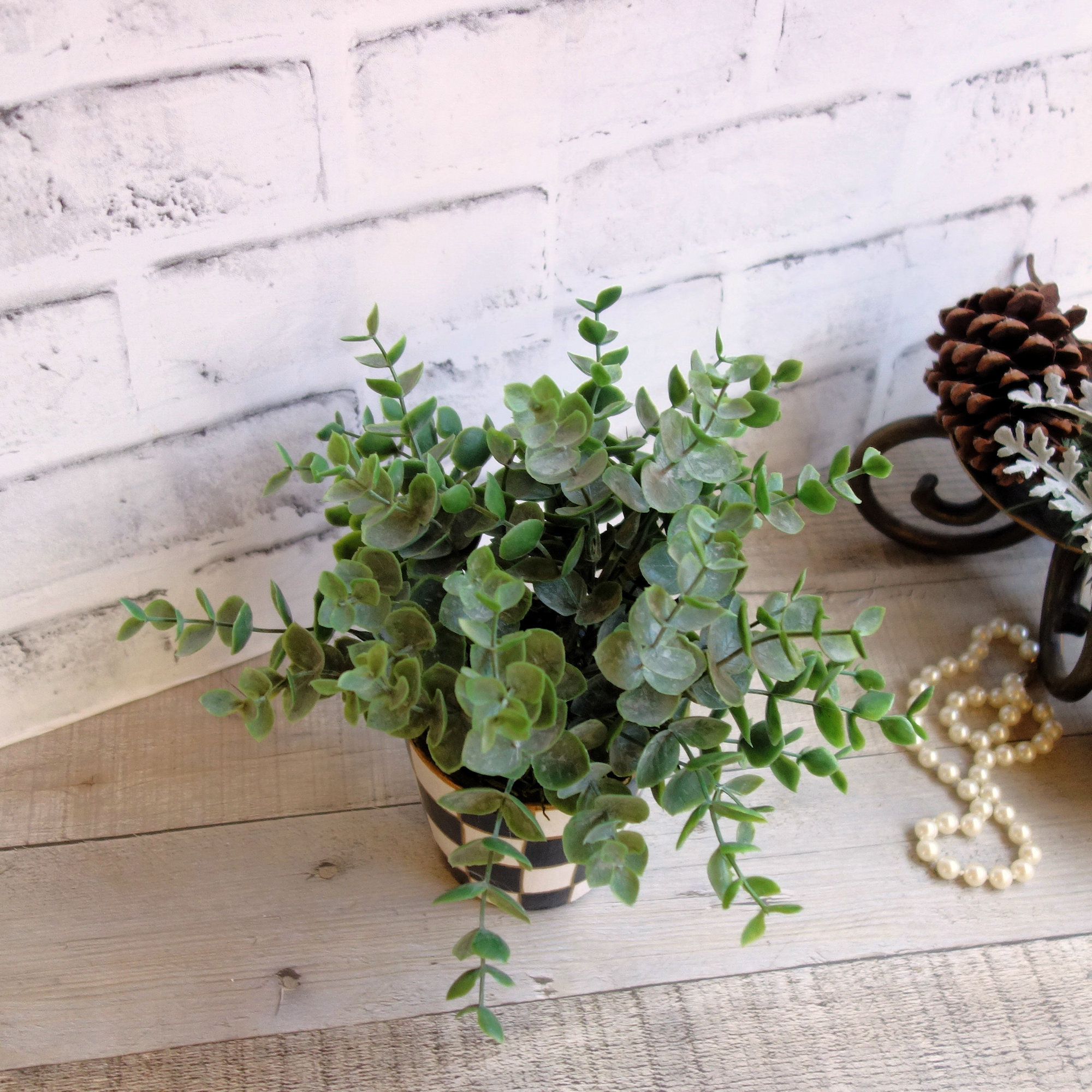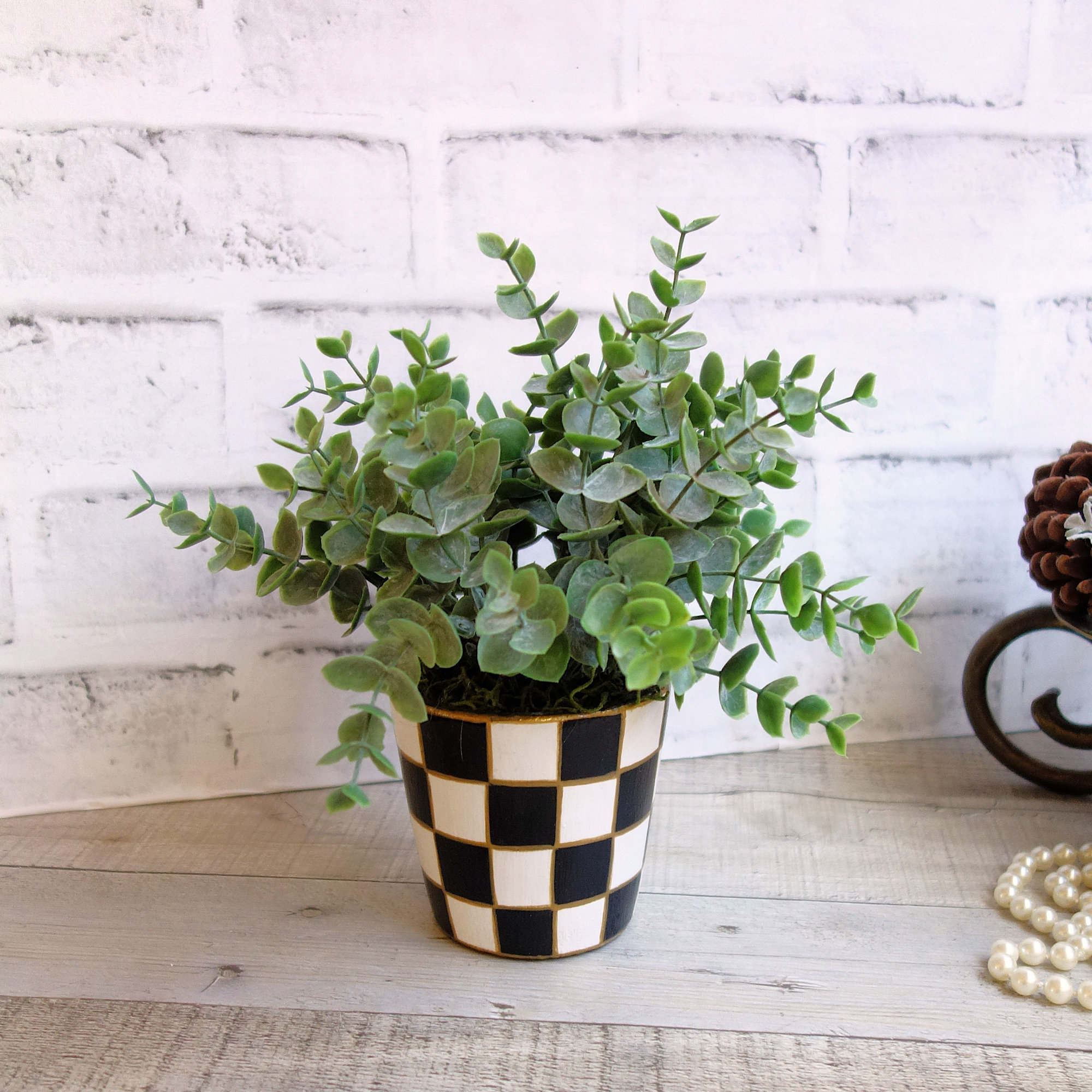 ARTISAN DETAILS The dusty, muted tones of the Eucalyptus leaves offer a sophisticated look to your décor. The heavy resin pot is hand rendered with my signature black and white checked motif with a high gloss finish. At 3/4 pound, this piece has a significant "weighted" presence, making it feel substantial and high-end compared to standard plastic alternatives.