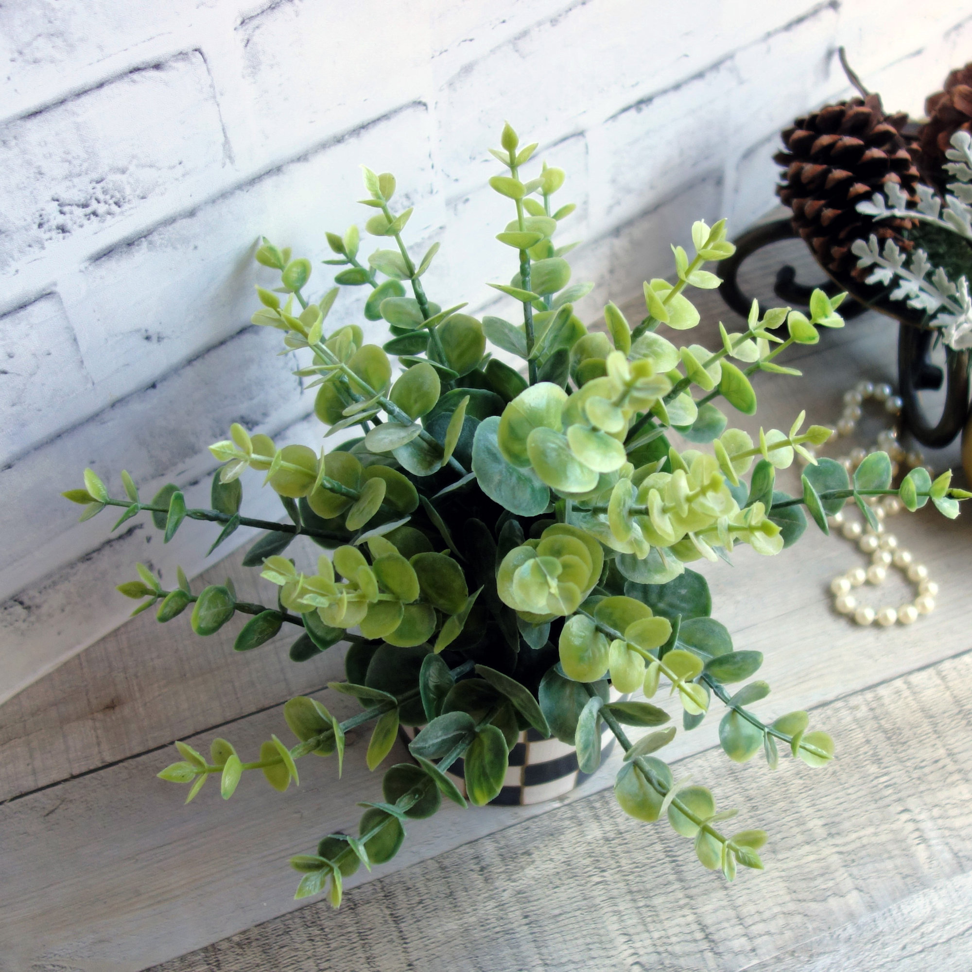 ARTISAN DETAILS This 9-inch arrangement features the dusty, silvery-green leaves of the Eucalyptus, beautifully anchored by my signature checked motif. The heavy resin pot has been hand-painted to create a crisp, high-contrast look that elevates the entire plant. Weighing nearly a pound, this piece has a premium, stable presence that sets it apart from common department store greenery.