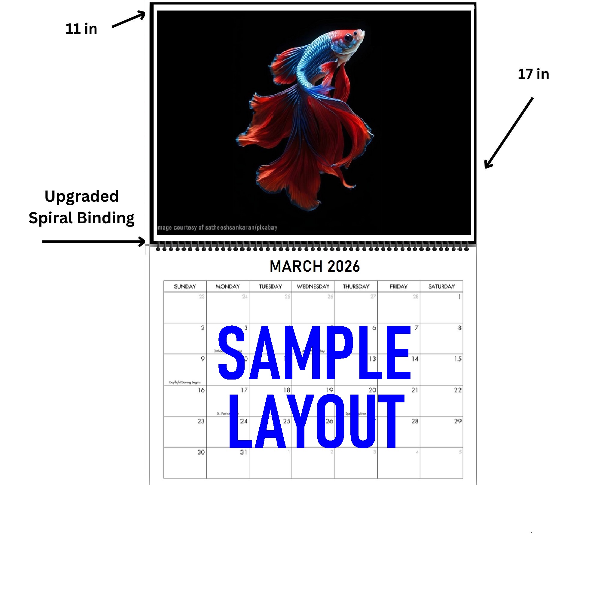 Are you a betta fish lover looking for that perfect betta fish with flowing fins and beautiful colors? Enjoy these fantasy betta images in this 2026 betta full size wall calendar with the most beautiful beta fish pictures to carry you all the way through the year. High quality photo calendar makes an excellent gift for betta lovers with its eye popping color on 32lb photo paper; spiral binder guaranteed to lay flat; protective covers front and back and a super sticky clear hanging hook attaches to the cover to display without damaging the beautiful images. Full size, large images with boxed calendar dates to enter appointments and notes. Locally printed, quality checked 3 times and shipped by me (no drop shipping). Full size wall measurement is 11x17 inches.