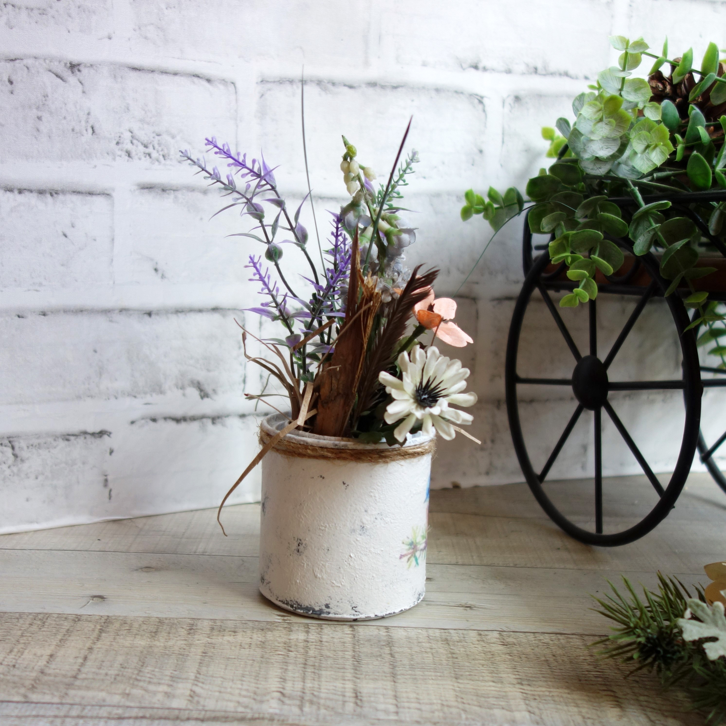Rustic style and chippy look, this mini wildflower arrangement features a medley of mixed florals in hand cut straw filler set in a makeshift 8 ounce can distressed with a vintage look and accented with a beautiful bluebird perched on a branch. A great piece to gift with a card, display on your tiered tray or a window sill. Easily compliments farmhouse decor, French country decor, shabby chic decor, vintage decor, Victorian decor as well as cottage core decor. Plastic can simulates a vintage metal can appearance. 3 in. x 8 in., light weight 2.5 oz.