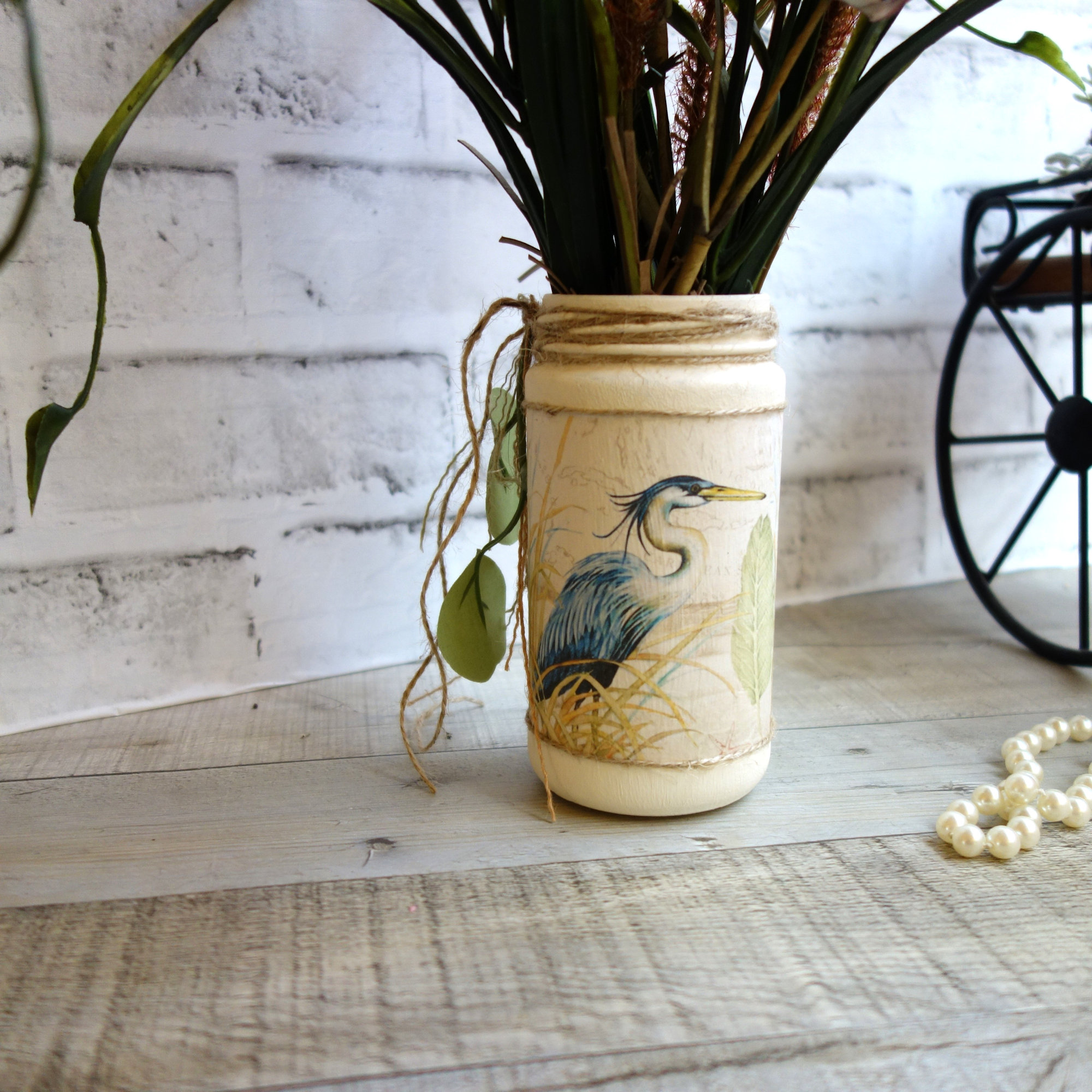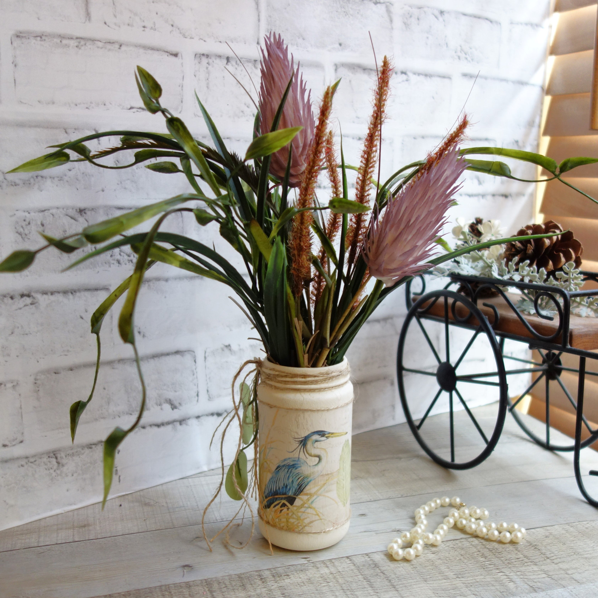 Coastal Elegance: Blue Heron Botanical Vase and Floral Arrangement