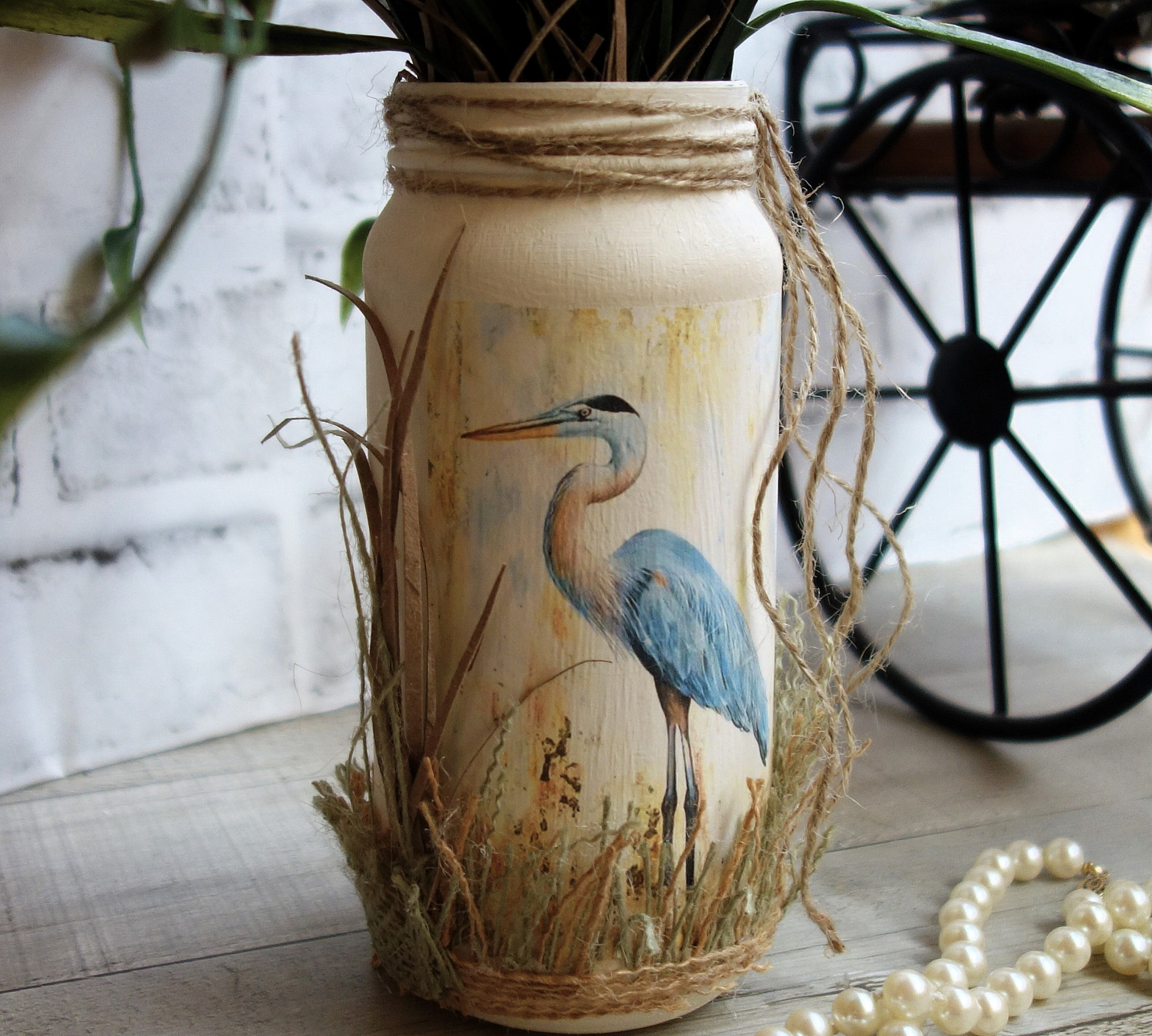 Original Artist-Designed Salvage Art: Blue Heron in the Marsh brings the serenity of the wetlands right into your home with this unique home decor art that transforms salvage glass and vintage marsh florals into a stunning focal point, perfect for adding a touch of rustic coastal charm to any room.
