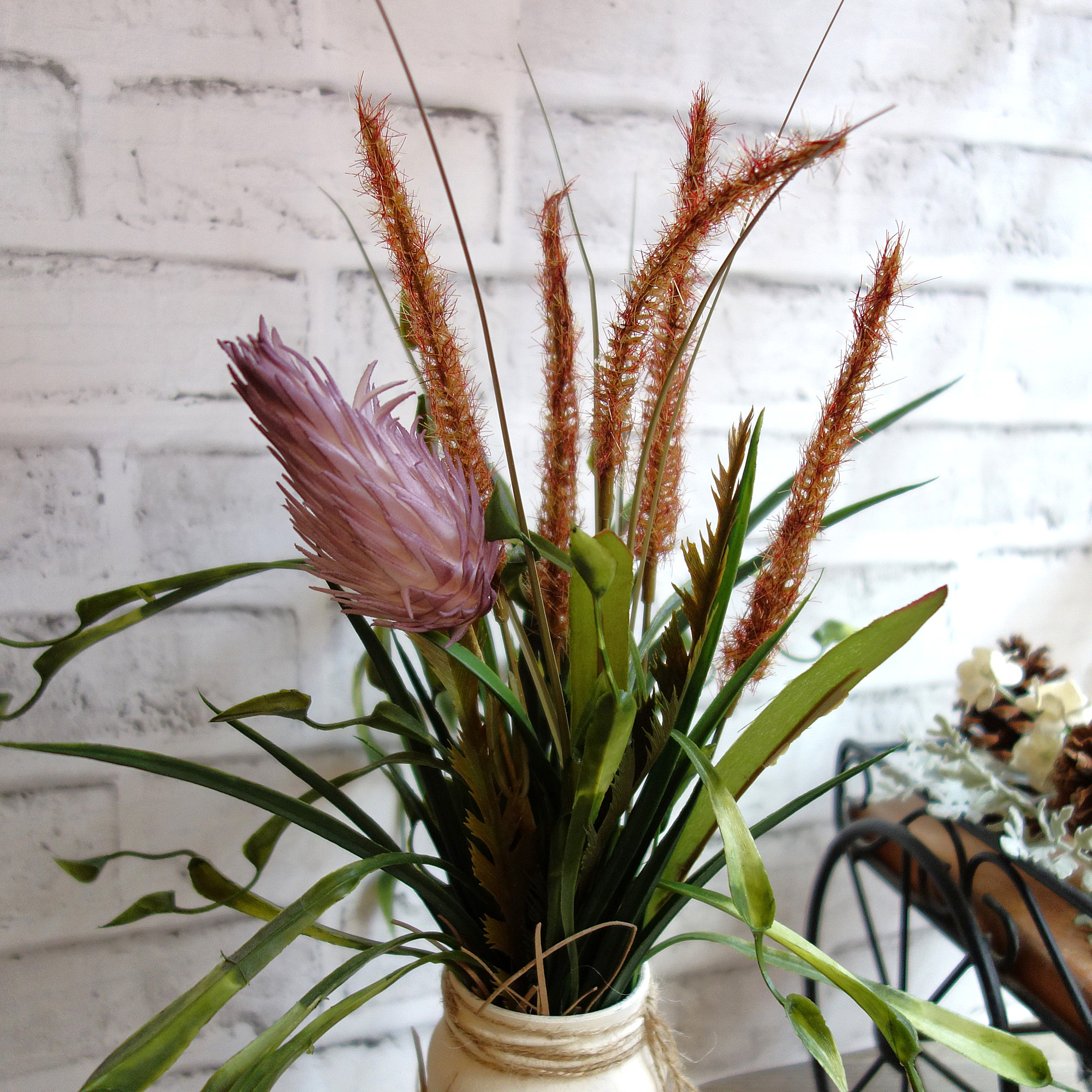 Hand crafted, the design features a stunning blue heron image overlay in a graceful stance amongst a marsh setting on a hand-painted, soft background. Embellished with natural materials to bring to life the bird itself in a wetland setting surrounded by the lush arrangement mix of faux marsh grasses, reeds, cattails and an elegant lavender-hued floral spike, capturing the essence of the marshy wetlands.