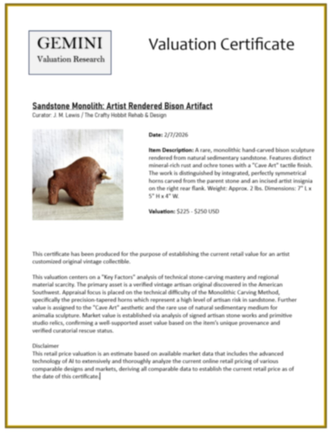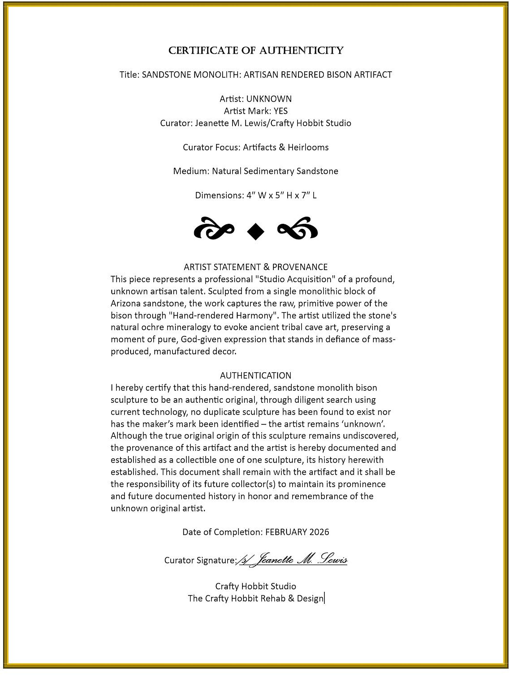 I hereby certify that this hand-rendered, sandstone monolith bison sculpture to be an authentic original, through diligent search using current technology, no duplicate sculpture has been found to exist nor has the maker’s mark been identified – the artist remains ‘unknown’. Although the true original origin of this sculpture remains undiscovered, the provenance of this artifact and the artist is hereby documented and established as a collectible one of one sculpture, its history herewith established. This document shall remain with the artifact and it shall be the responsibility of its future collector(s) to maintain its prominence and future documented history in honor and remembrance of the unknown original artist.