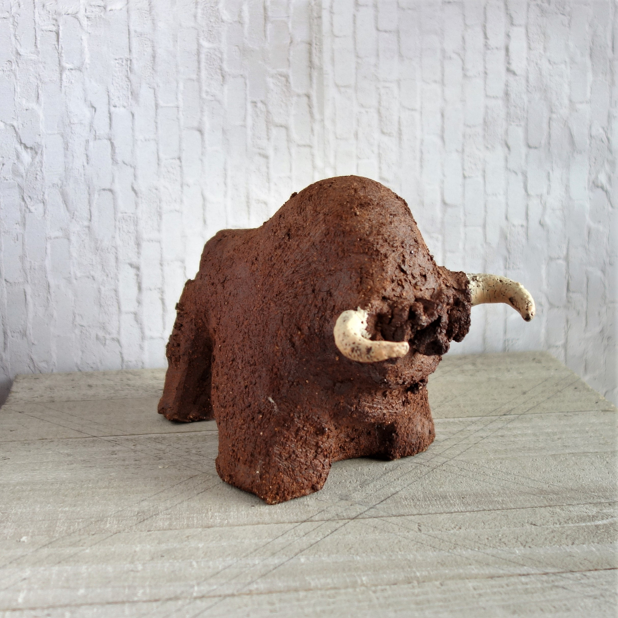 The story behind this piece: I am a vintage rehab and design artist. I procure and redesign high-end vintage items for a refreshed designer presence and a handcrafted character for modern home collectors. Occasionally during my searches, I find and rescue random vintage pieces that are cast away by people who do not see the beauty in hand crafted or hand painted items. This amazing bison sculpture was discarded by someone who most likely thought the rough surface was not polished, not "Danbury Mint", a worthless artist attempt that failed. Sadly, the largest portion of our world prefers mass produced, manufactured perfect pieces that are pumped out by the thousands with a numbered certificate - those can easily be found in over-abundance for resale on all marketplaces. But true art collectors look for the 1 of 1 artist original that captures the artist's expression and inherent, God given talent - and clearly, manufacturing is not a God given talent. So, I hope you will celebrate with me this unknown and very talented sculpture artist who created this amazing sandstone bison. I would keep this piece myself however, it does not remotely match my decor thus I have no place to display it - but as a design artist I was compelled to rescue it upon finding it and ensure that it reaches an appropriate collector with similar theme/style. Please read on...