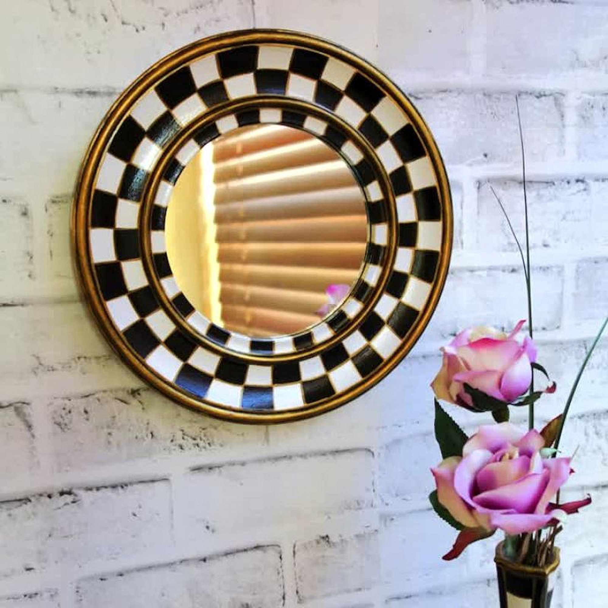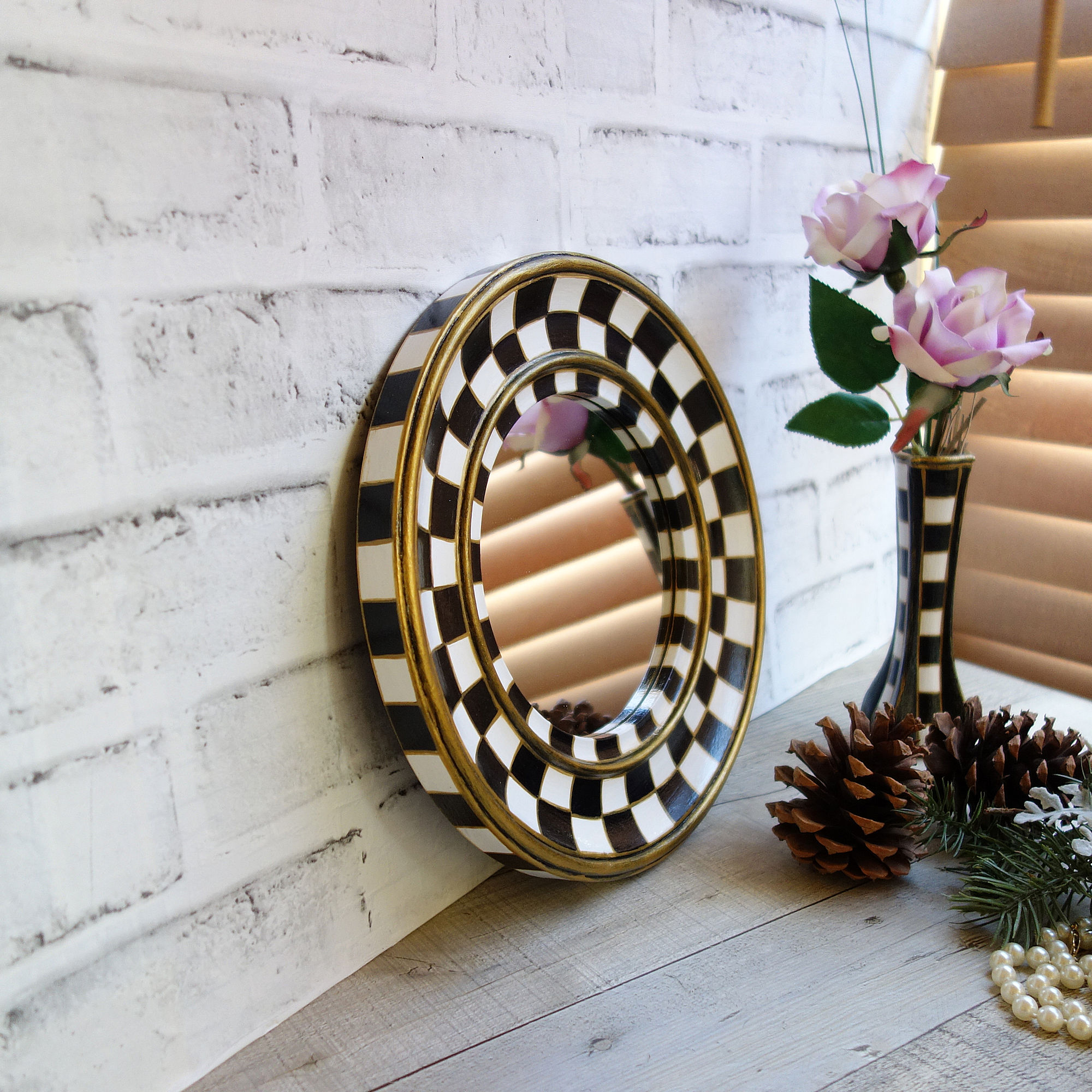 Black and white checked accent mirror pairs easily with all mackenzie childs checked decor, courtly styled decor, farmhouse buffalo check decor, checked kitchen decor, checked wall decor, checked candles, checked planters, checked urns, checked picture frames, checked vases, checked candle holders and French Country decor.