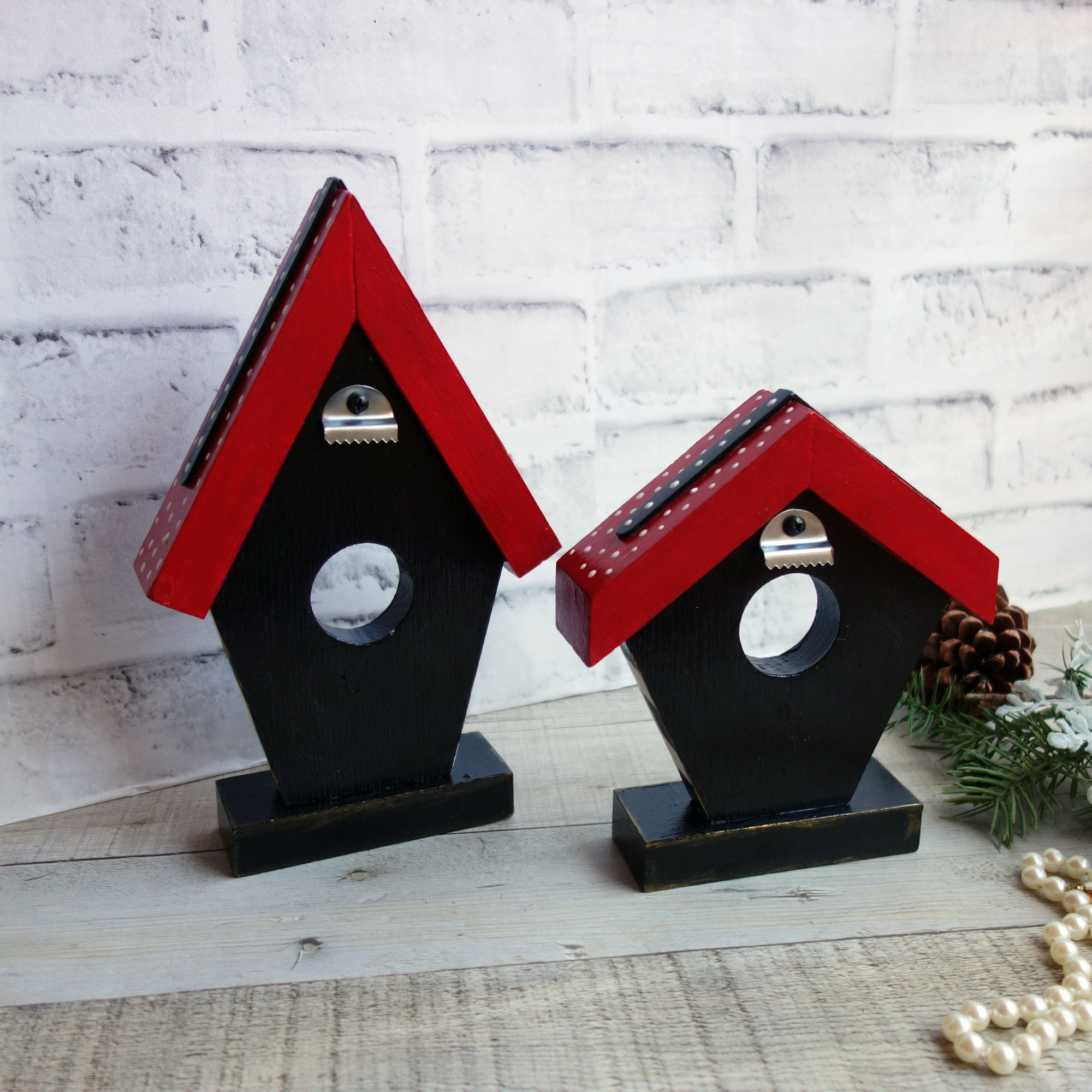 Checked whimsy birdhouses will bring a smile and brighten any space, hand painted with black and white checked pattern and fun polka dots on a contrasting red roof design. Each checked birdhouse is solid wood and wide enough to stand alone together as a small grouping or separately. A sturdy steel hanger on the backsides allow for hanging on a wall in the smallest of spaces. 8.75 in. tall and 6.5 in. tall, approx. width is 5.5 in.