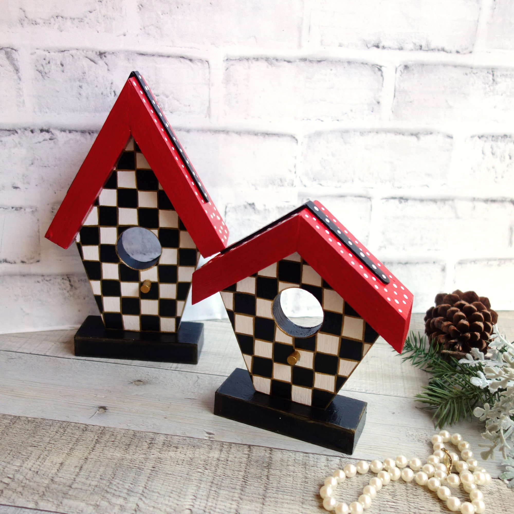 Checkered Birdhouse Decor Set pairs easily with Mackenzie-childs checked decor, farmhouse buffalo check decor, chintz decor, hand painted whimsy decor, checked courtly decor, checked planter, checked urn, checked mantle decor, checked flower pot, checked bird figurines, checked spring decor.