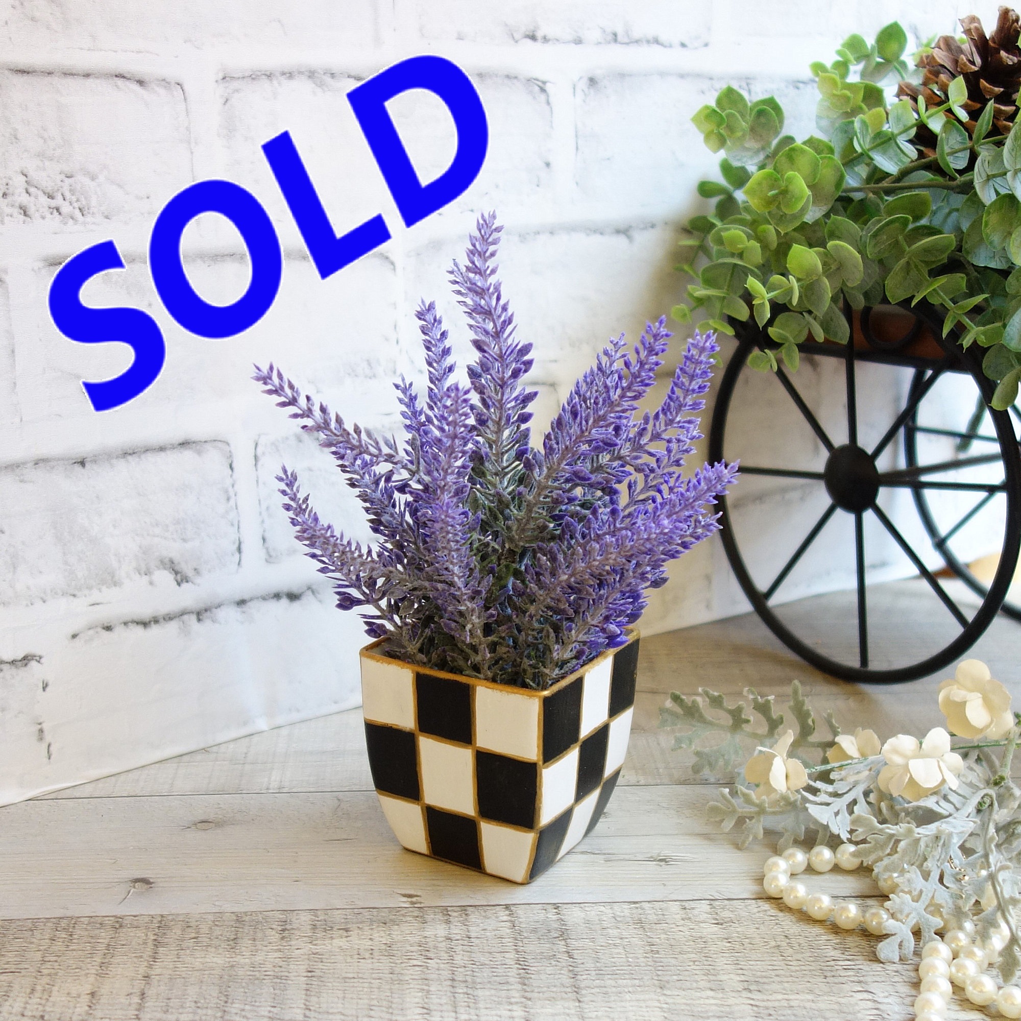 Black and white checked spring and summer decor features life-like greenery potted plant with faux lavender florals. Checkered pattern trimmed in vintage gold blends seamlessly with courtly decor collections. Life-like plant in a 2.5 in. pot, total height approx. 8 inches. Beautiful with your checked patio decor, checked mantle decor, mixed with your buffalo check kitchen decor or as a gift for that check lover in your life. Weight approx 12 oz. *insured shipping