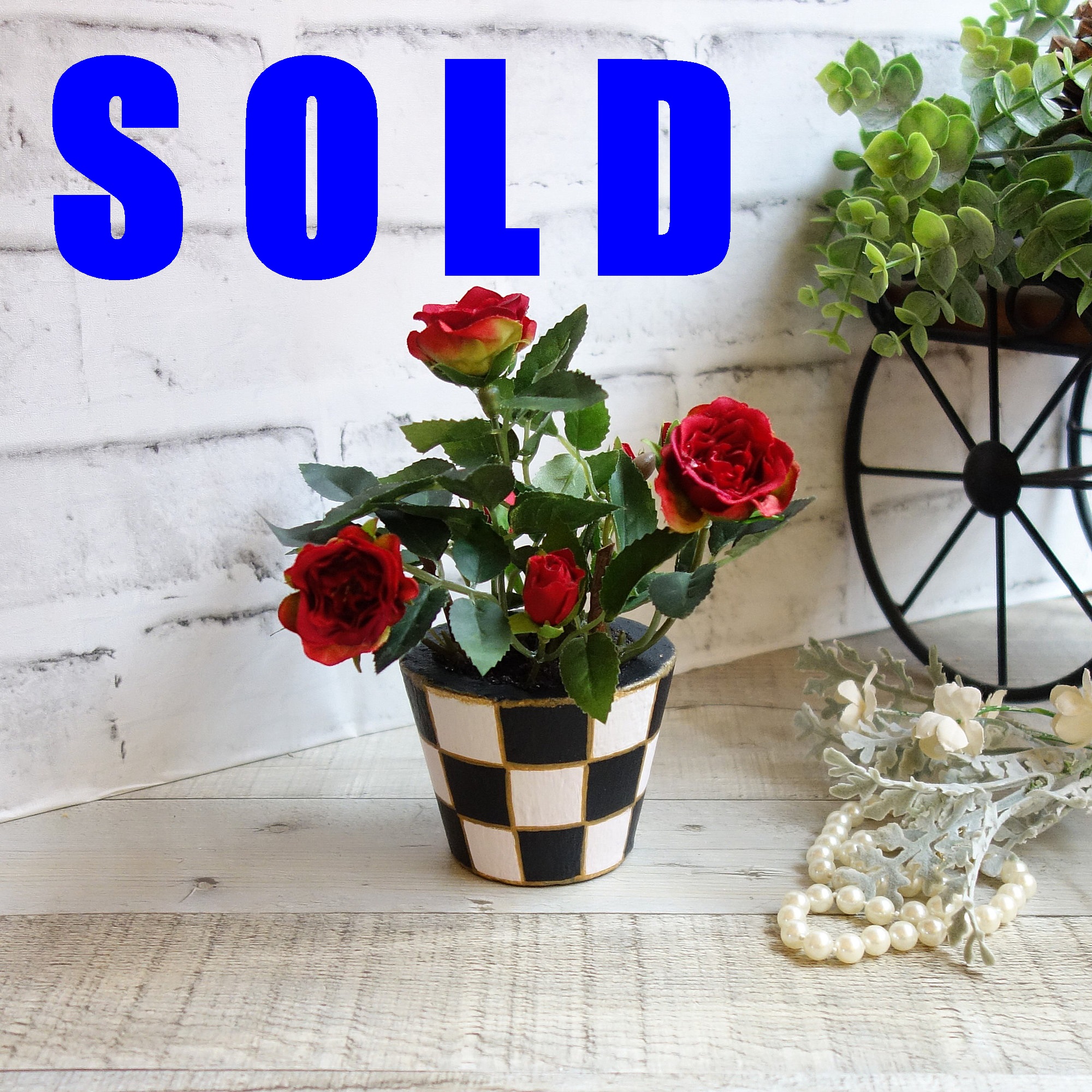 These artificial miniature roses will add a pop of color and cozy to your home as well as make a great gift. The checked flower pot is heavy resin filled with artificial stone dirt and a true to life look artificial miniature rose bush. Checks with roses décor are highly popular and will look great as a set or individually. Approx. 6.5 in. tall., 2.5 x 3 in. pots, weight approx. 11 oz. *insured shipping