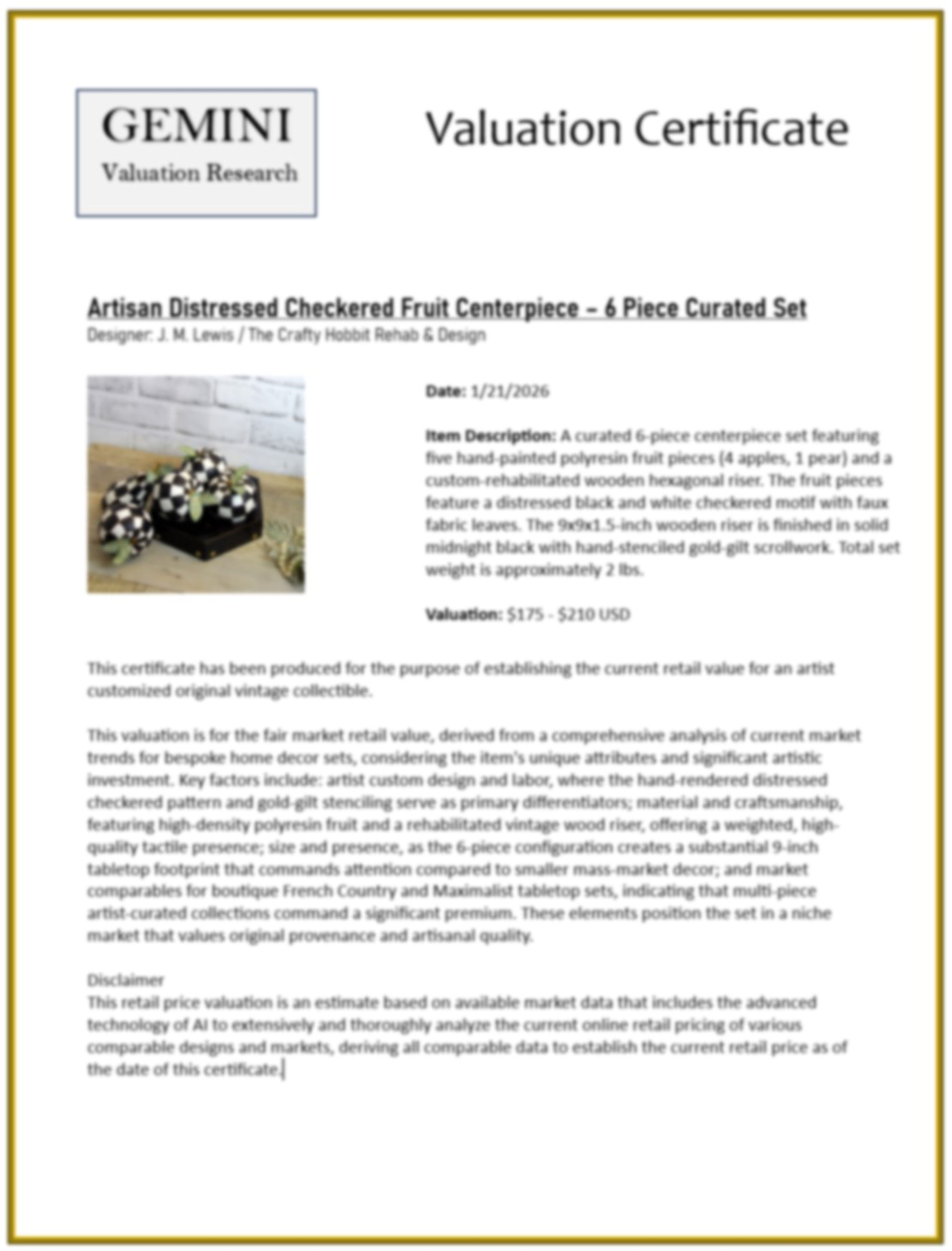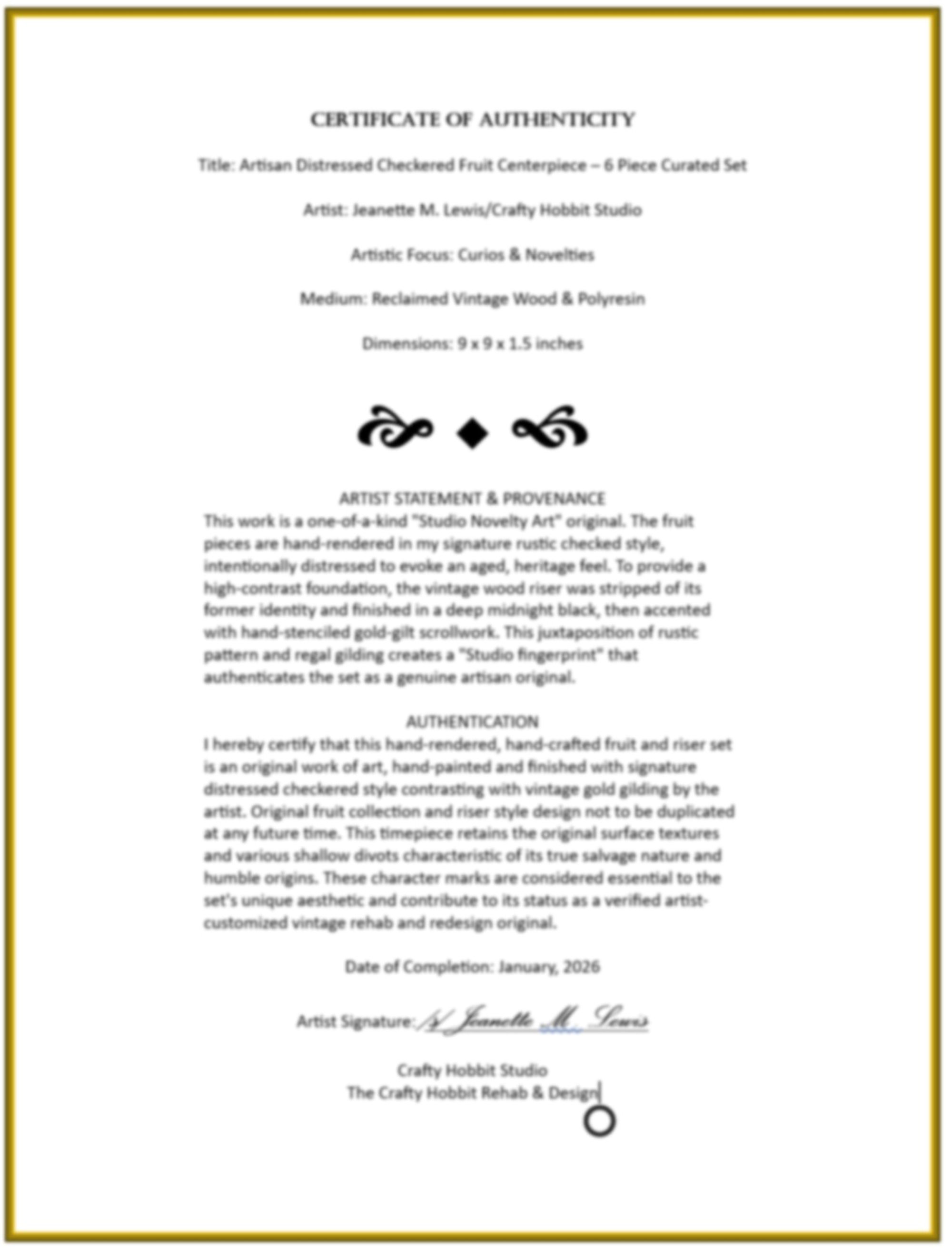 ARTISAN DETAILS The fruit pieces are hand-rendered in my unique signature rustic checked style, intentionally distressed to evoke an aged, heritage feel. To provide a high-contrast foundation, the vintage wood riser was stripped of its former identity and finished in a deep midnight black, then accented with hand-stenciled gold-gilt scrollwork. This juxtaposition of rustic pattern and regal gilding creates a "Studio fingerprint" that authenticates the set as a genuine artisan original.