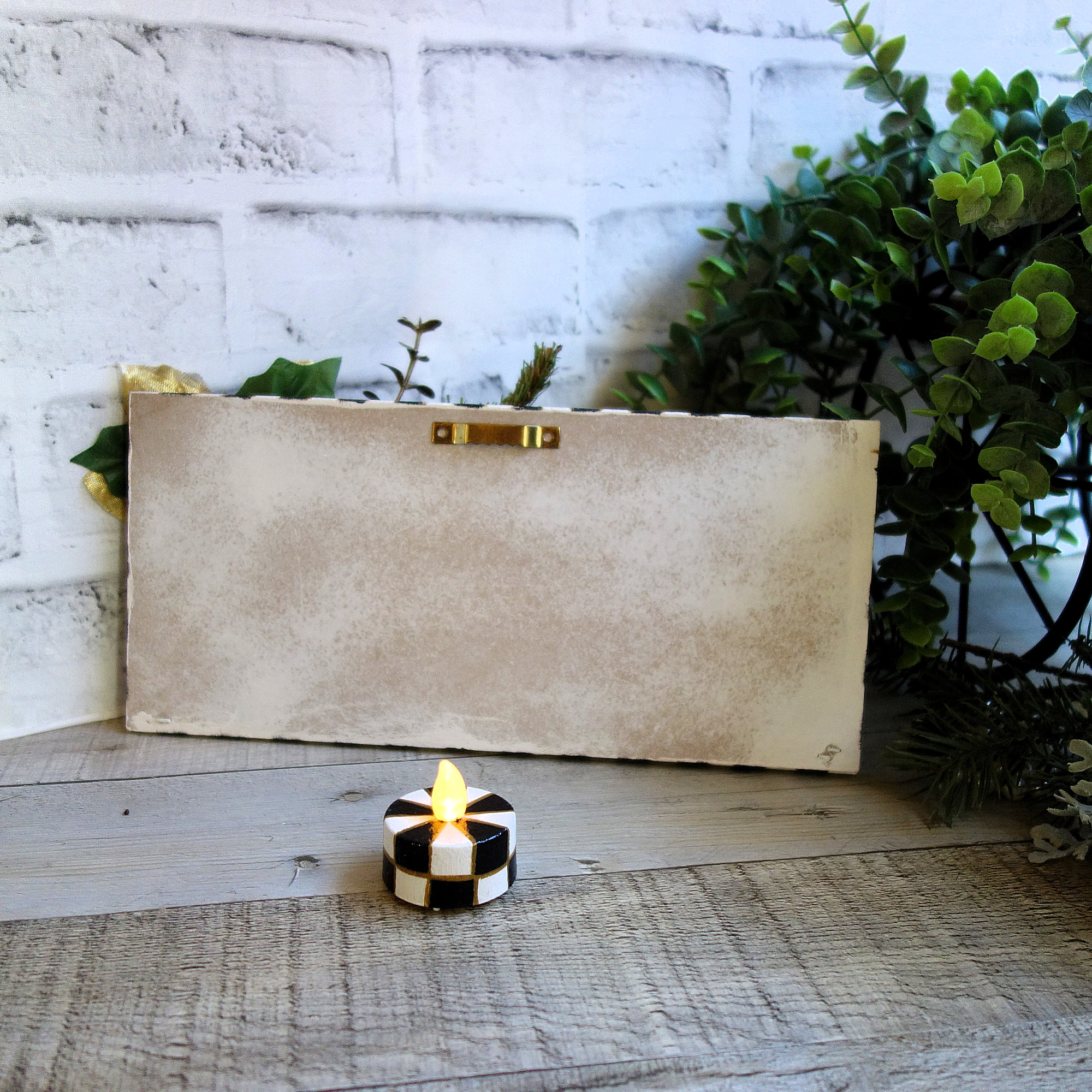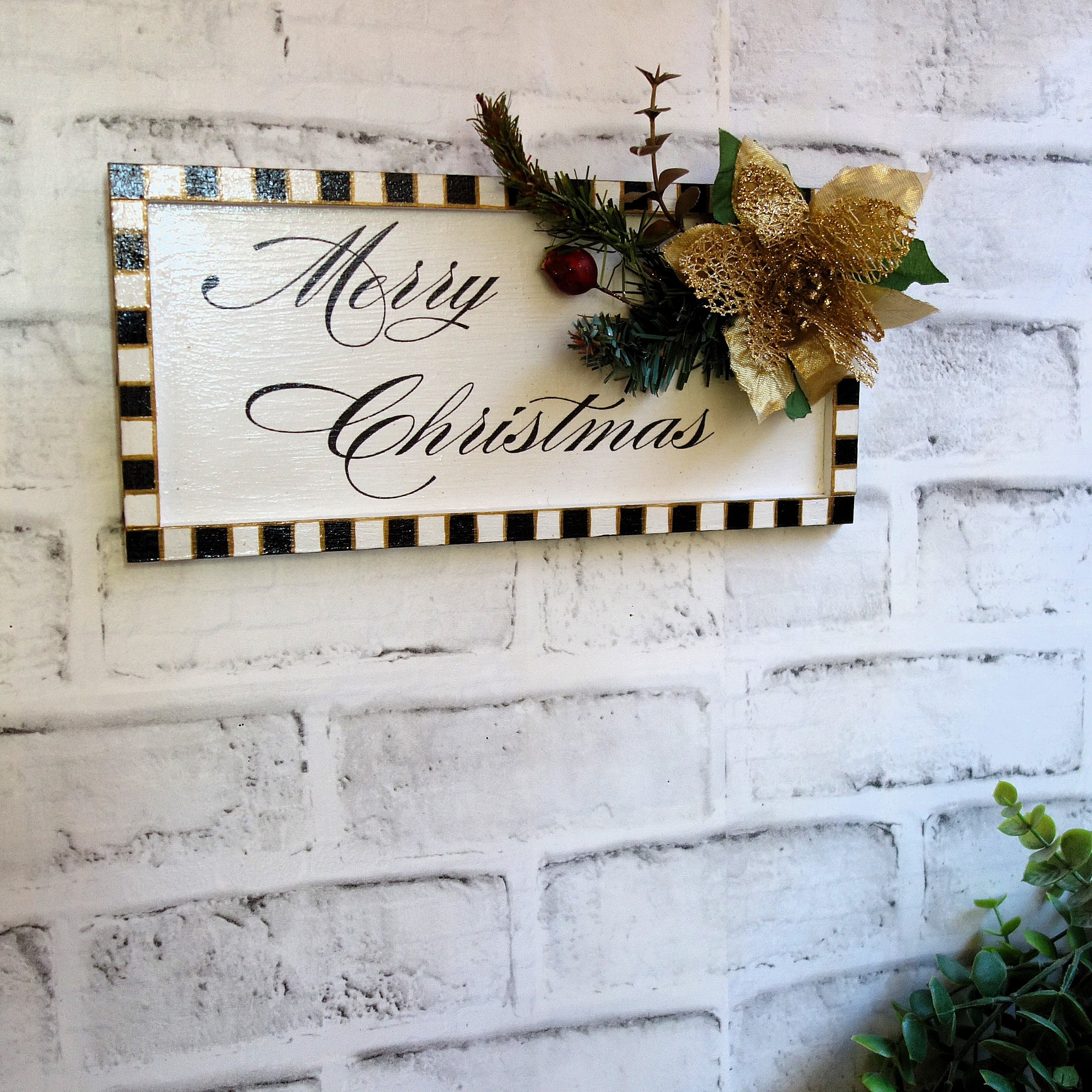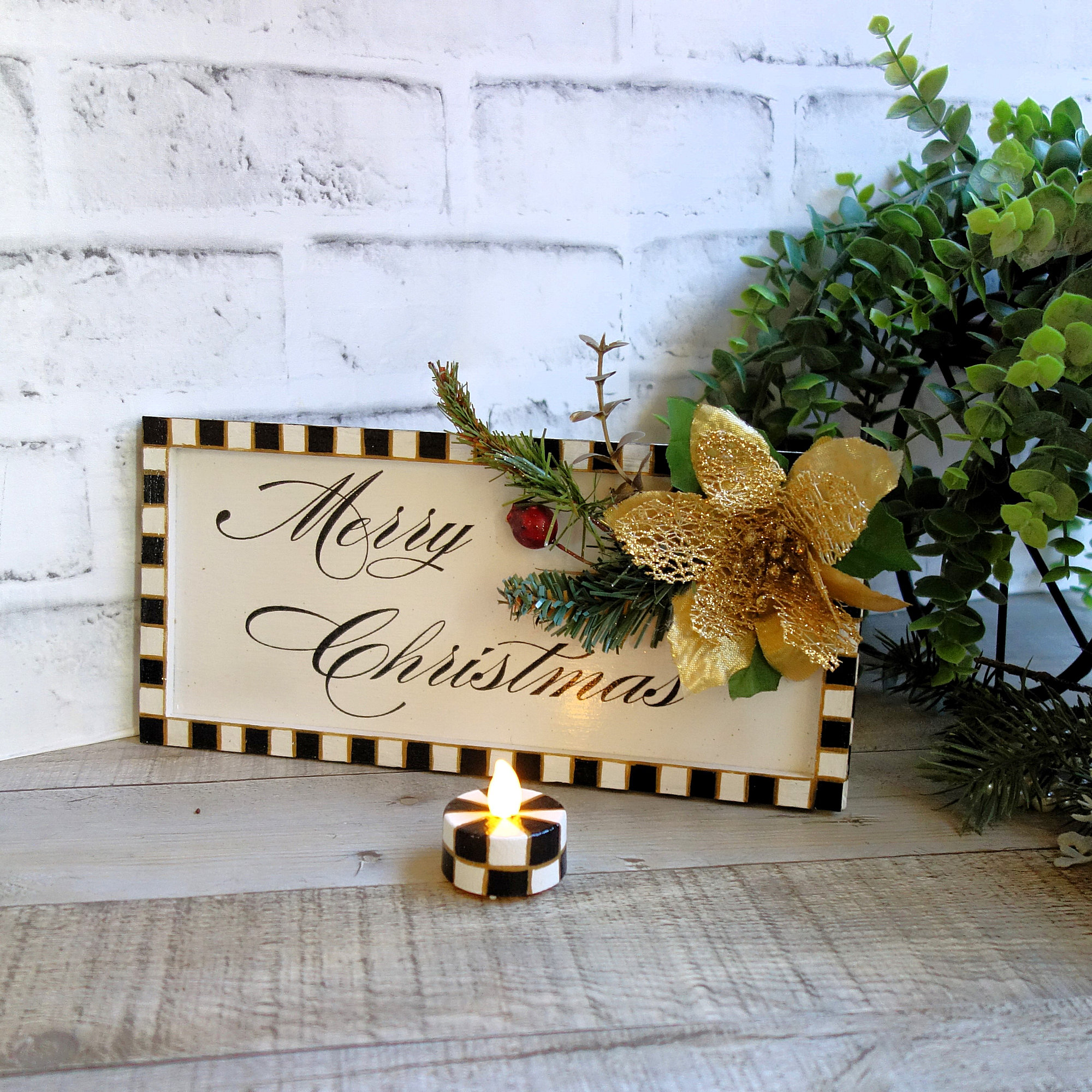 A traditional script style checked Merry Christmas sign to add to your checked holiday decor. Light weight framed style Merry Christmas checked sign features flowing script and hand painted checkered pattern with festive holiday accents. With a matching checked tea light candle, the set can be display together or separately. 10 x 4.75 x 3.75 inches, wood, 5 oz. Checked candle measures 1.5 x. 1.5 inches, on/off switch and replaceable battery compartment.