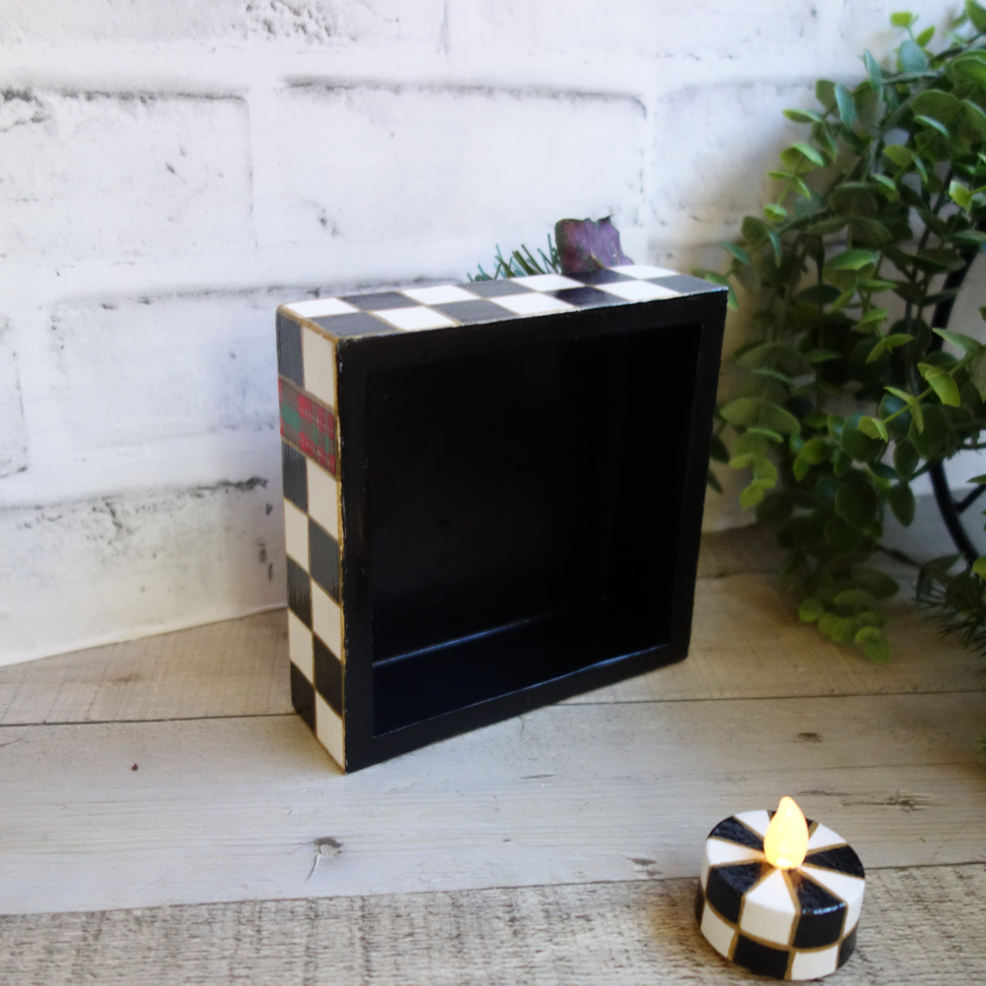 A lovely black and white checked Christmas sign to add to your checked holiday decor. This box style Merry Christmas checked sign features raised wood relief flowing script and hand painted checkered pattern with festive holiday accents. With a matching checked tea light candle, the set can be display together or separately. 5 x 5 x 1.5 inches, wood, 6 oz. Checked candle measures 1.5 x. 1.5 inches, on/off switch and replaceable battery compartment.