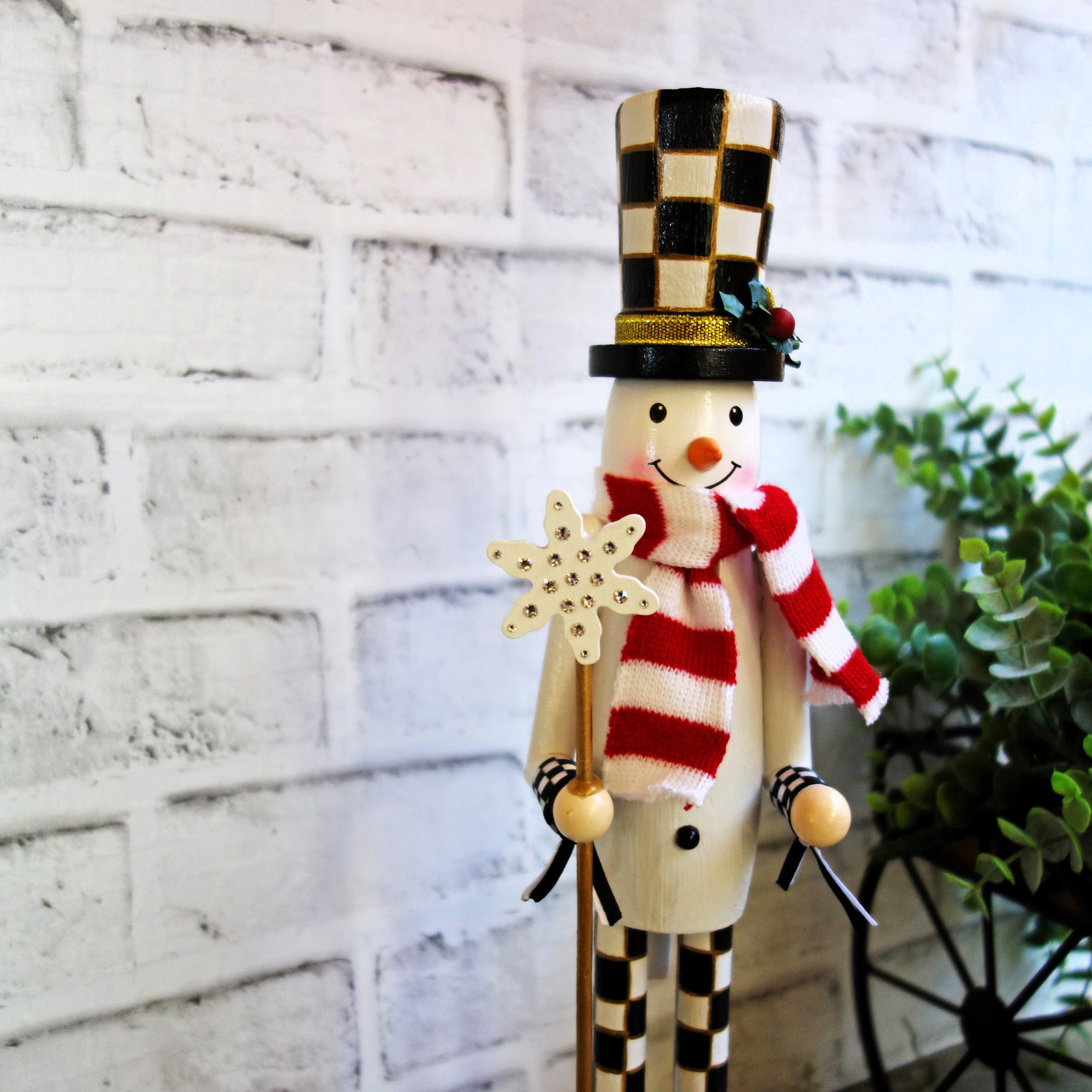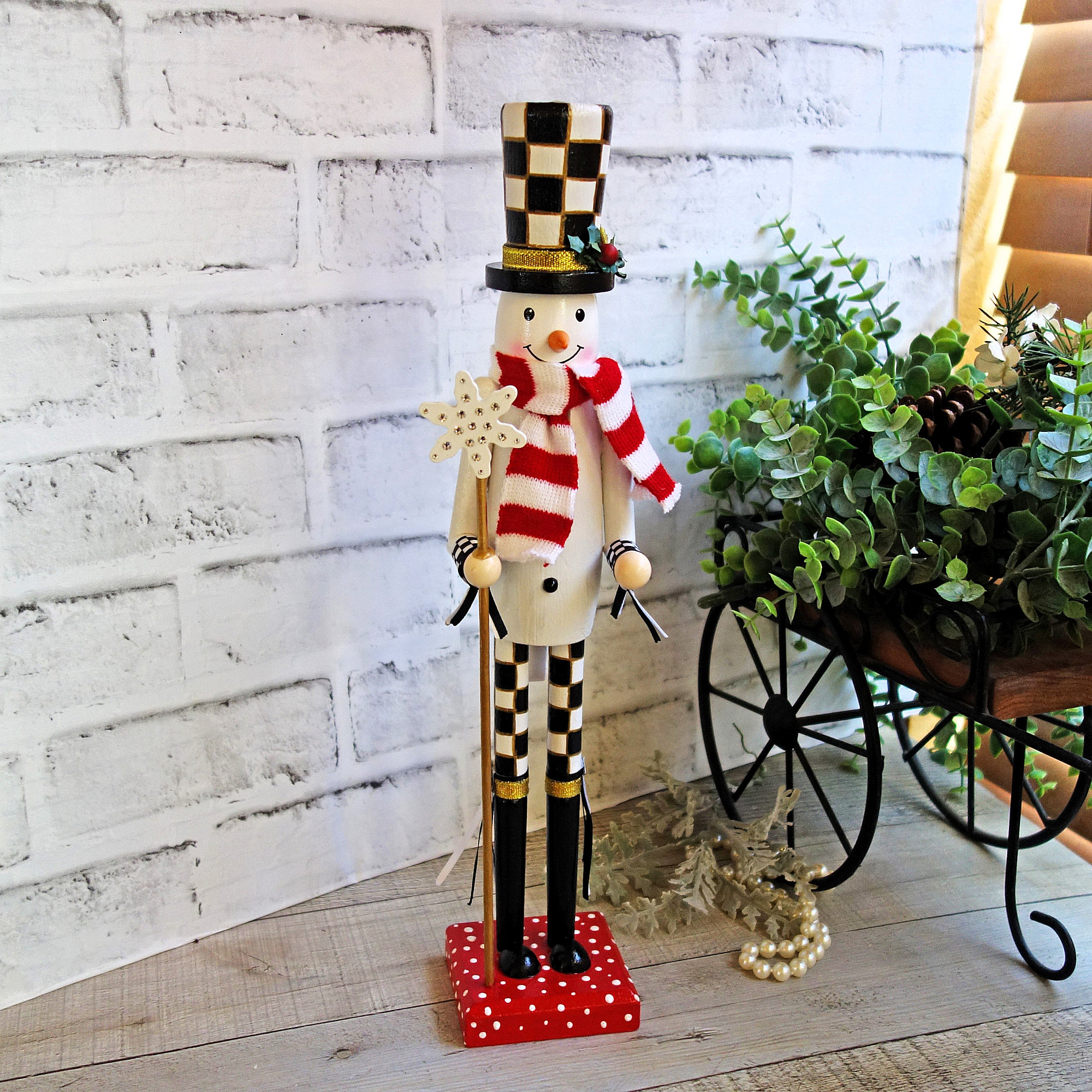Designer-inspired, this snowman nutcracker will captivate guests with his friendly, welcoming style. His tall hat and waistcoat combine playful with elegance; his black-and-white checkerboard pattern hat and knickers adding classical style with whimsy, perfectly contrasted by vivid holiday red on the base and scarf including matching whimsical polka dots - a reminder of falling snow during a cold winter season. His face styled with a gentle, cheerful expression, offers a delightful greeting to your guests.