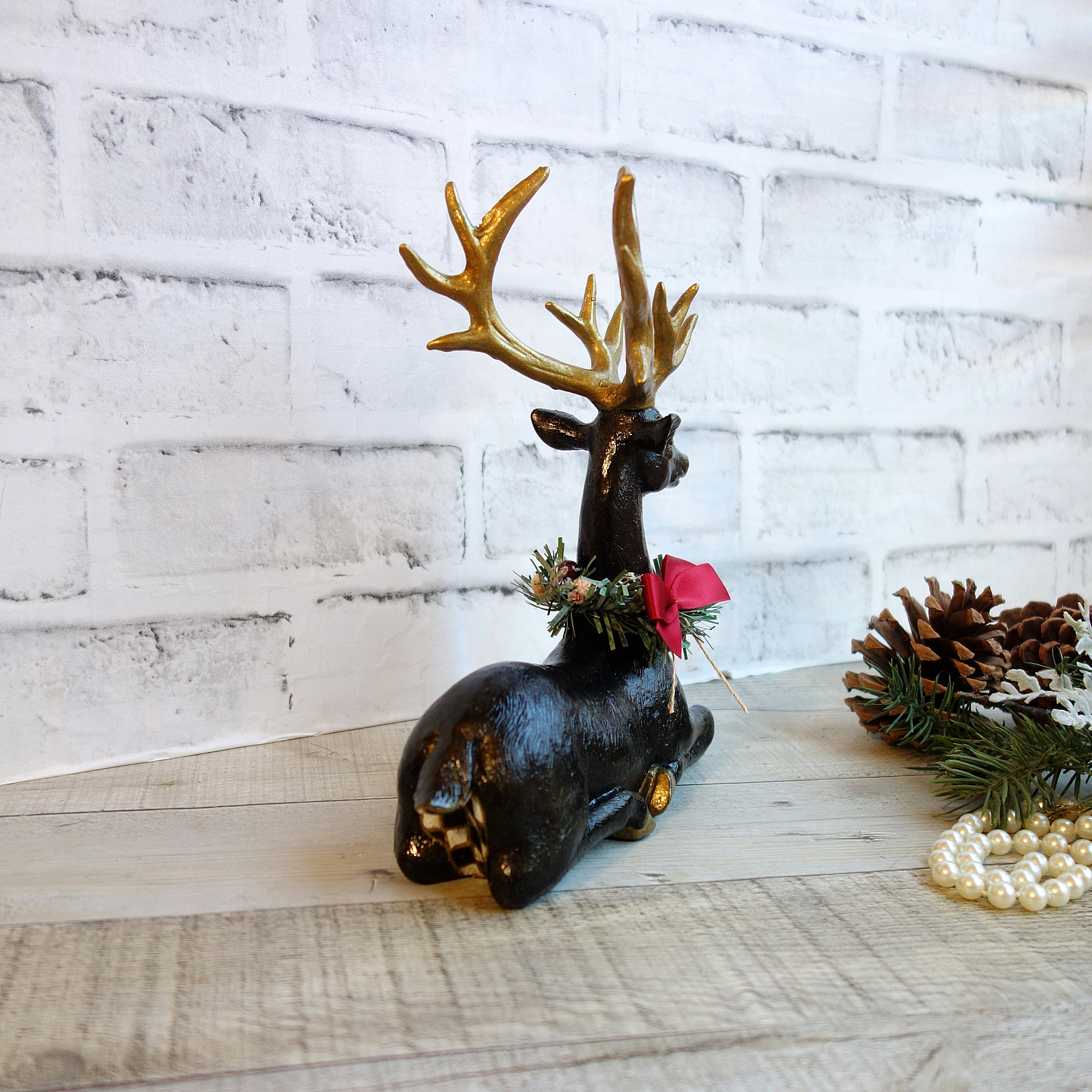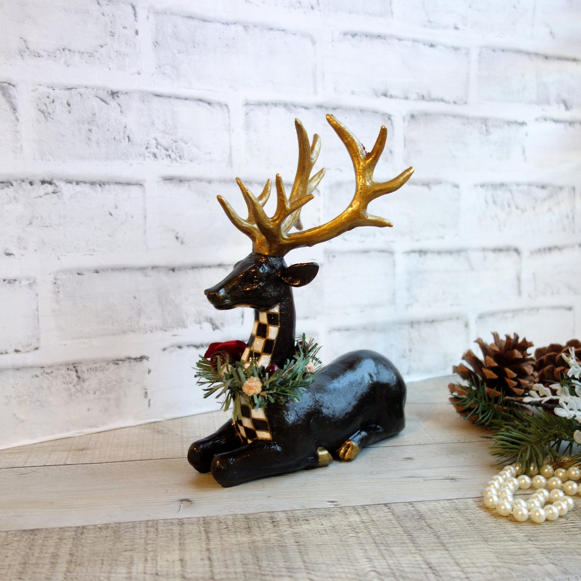 Black and white checked stag Christmas reindeer figurine will make a great addition to your checked mantle decor or checked holiday decorating. Hand painted resting buck features classic black and white checked pattern against glossy black finish; trimmed in vintage gold with a hand made evergreen wreath. Create a beautiful checked centerpiece table arrangement or display atop a fireplace mantle with checked candles and greenery. 8.5 x 7 x 2 inches, resin. 11 oz.