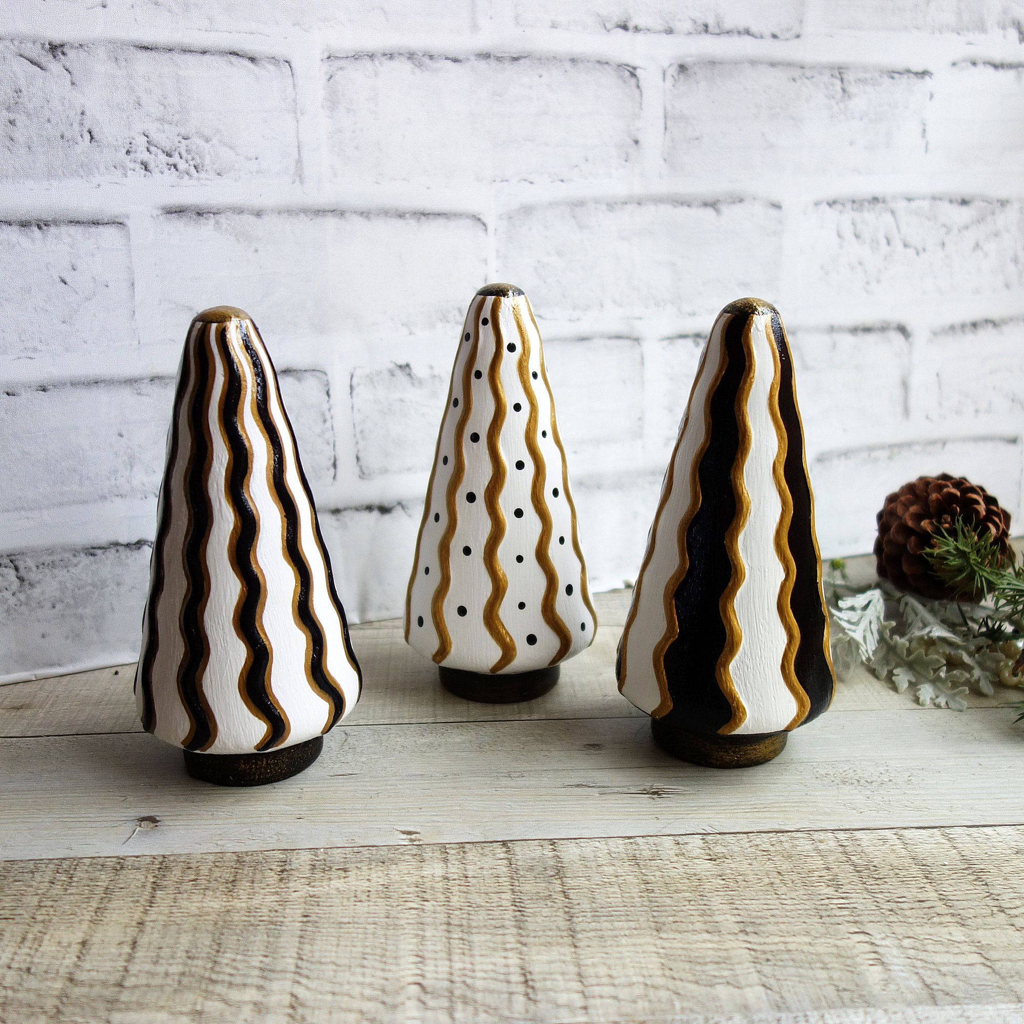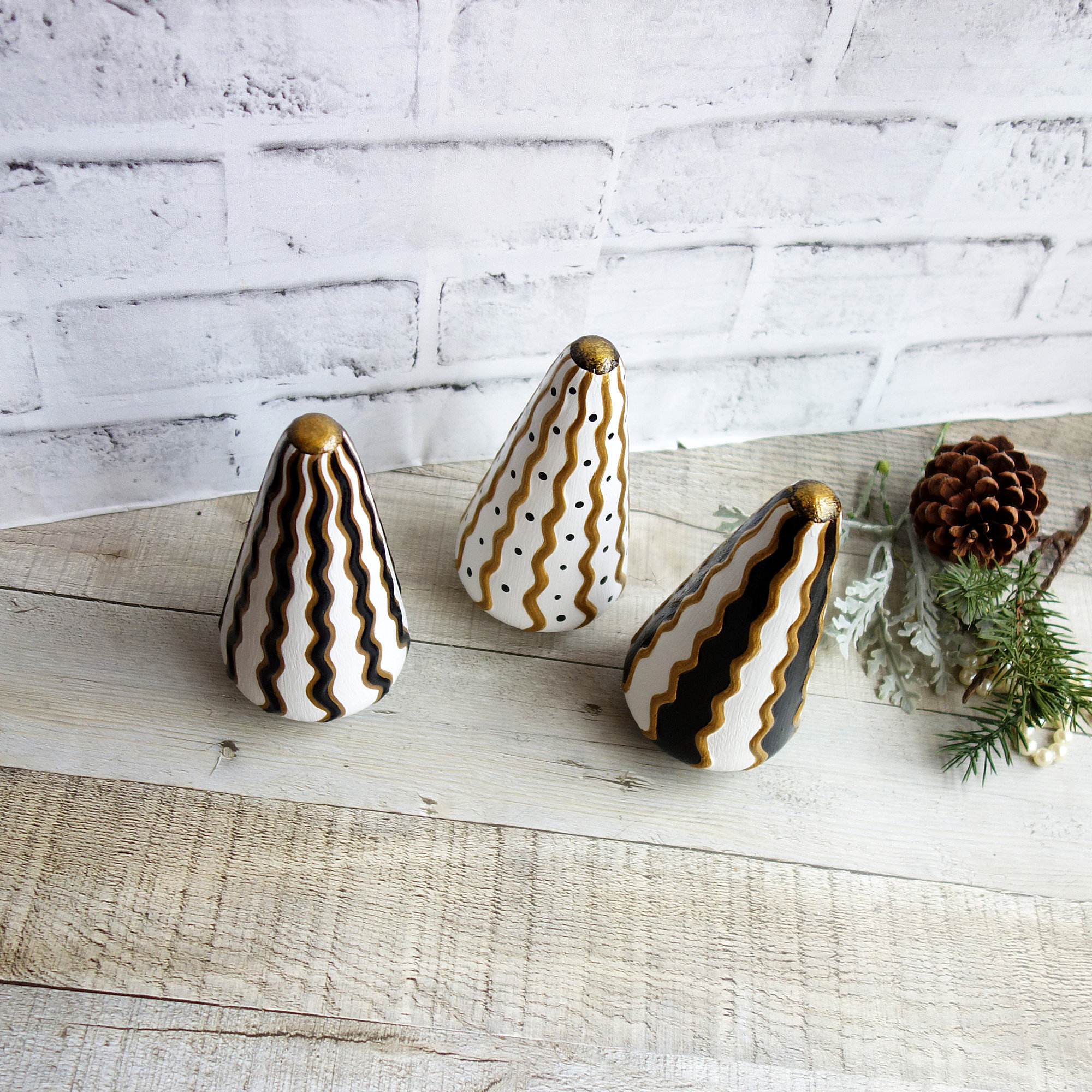 A beautiful set of MacKenzie-Childs inspired hand-painted ceramic Christmas trees is an artist original and one-of-a-kind ensemble designed to blend seamlessly with your Courtly Christmas styled decor. As a set of three, these black and white Christmas trees will display beautifully with checked mantle decor, arranged as a dining tablescape centerpiece or reflected in a mirror at your entryway to greet guests. Designed for the discerning collector, this three-piece set captures the whimsical elegance of the beloved black and white decor style, accented with vintage gold trim. Set/3 6x3 in.