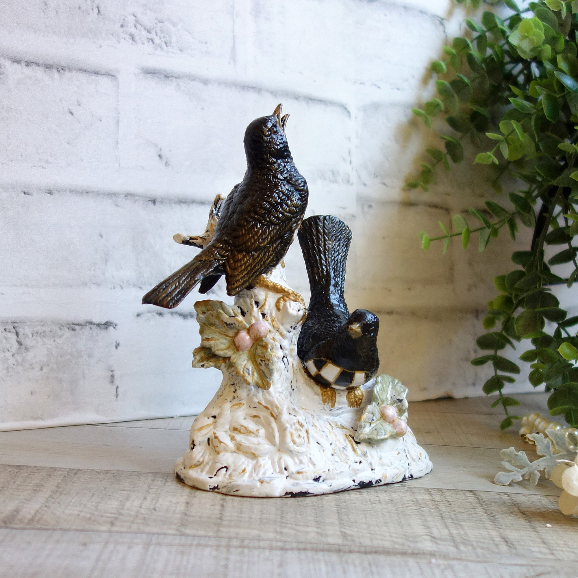 This vintage songbird pair has a lot of texture that really contrasts the gold and black around the body and head; hand painted black and white checked chests, accented with vintage gold trim. Pairs nicely with your courtly home decor. Ceramic. 6x5x3 inches; weight 9 oz.