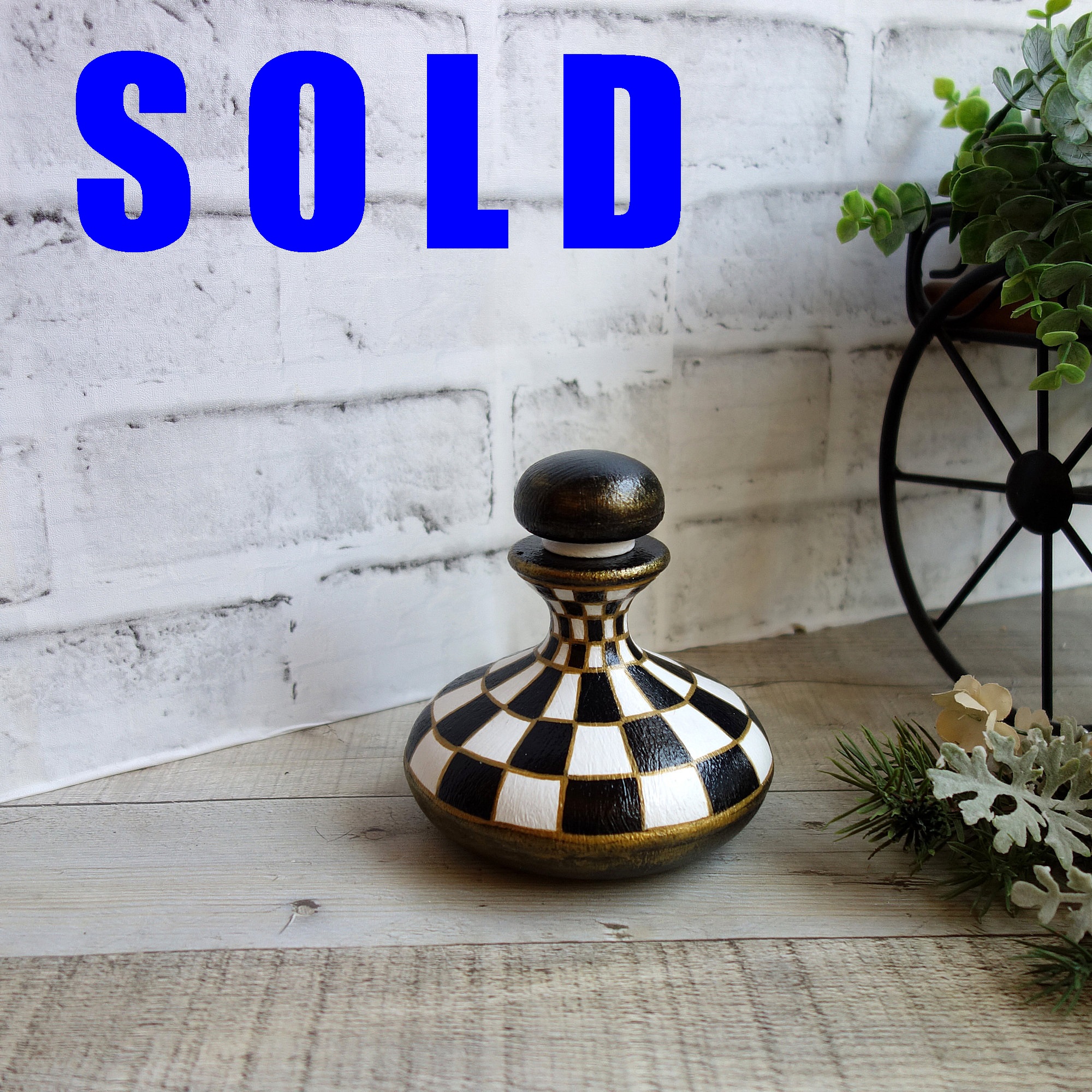Crafted with a vintage appeal, this decorative bottle is a piece of art designed with a pattern of black and white checks, trimmed in vintage gold. A matching smooth, domed top is permanently sealed and dusted in lustrous gold highlights to enhance the textured surface detail. Glass, 4.25 x 4.25 in., 9 oz.