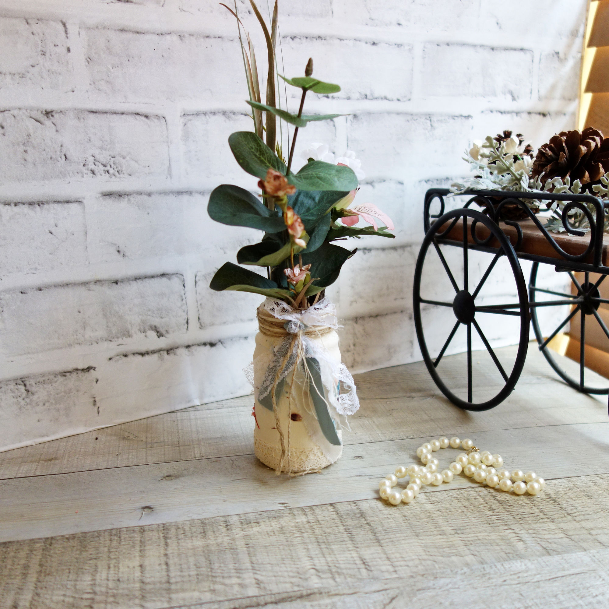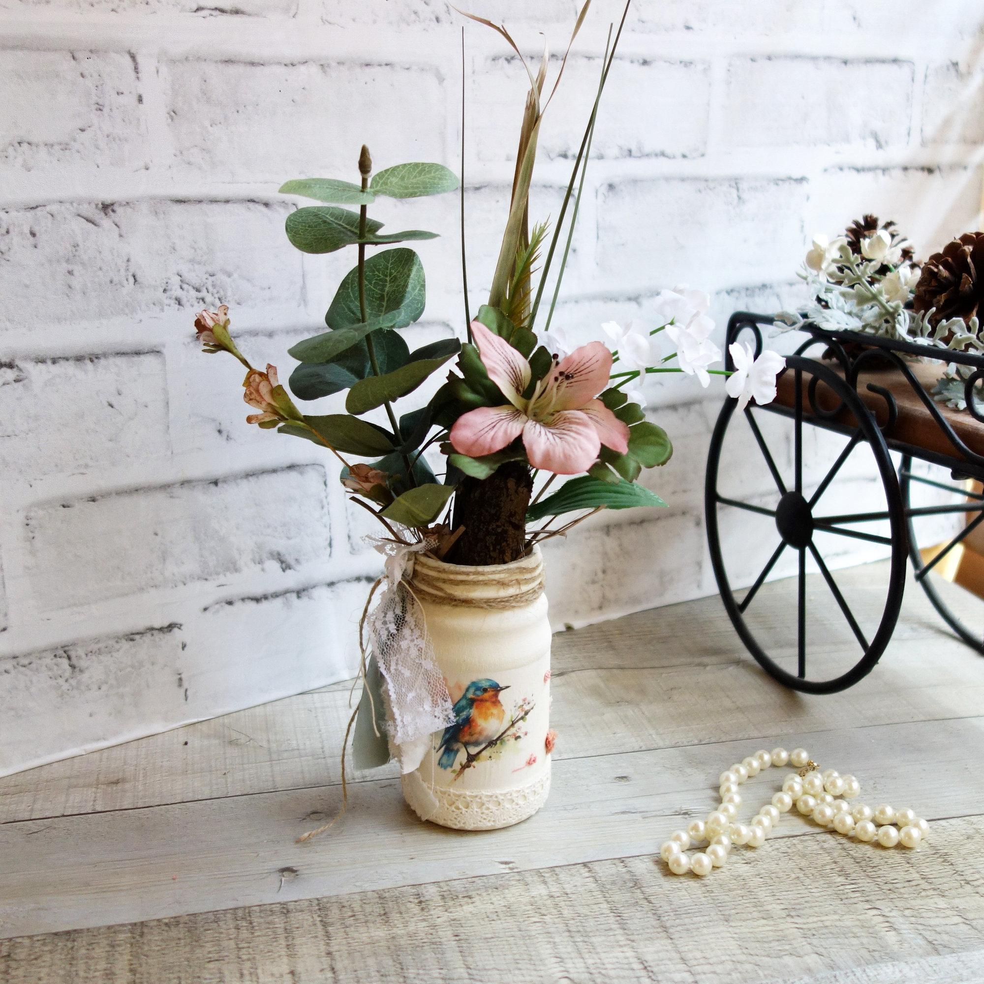 A true one of a kind multimedia art featuring over a dozen unique materials that make it the perfect arrangement that blends seamlessly with many decor styles including shabby chic, French country, Southern lifestyle, farmhouse, cottage core and more. A great little floral arrangement for a birthday gift, get well soon wishes, housewarming gift, happy anniversary or perhaps just simply thinking of you.