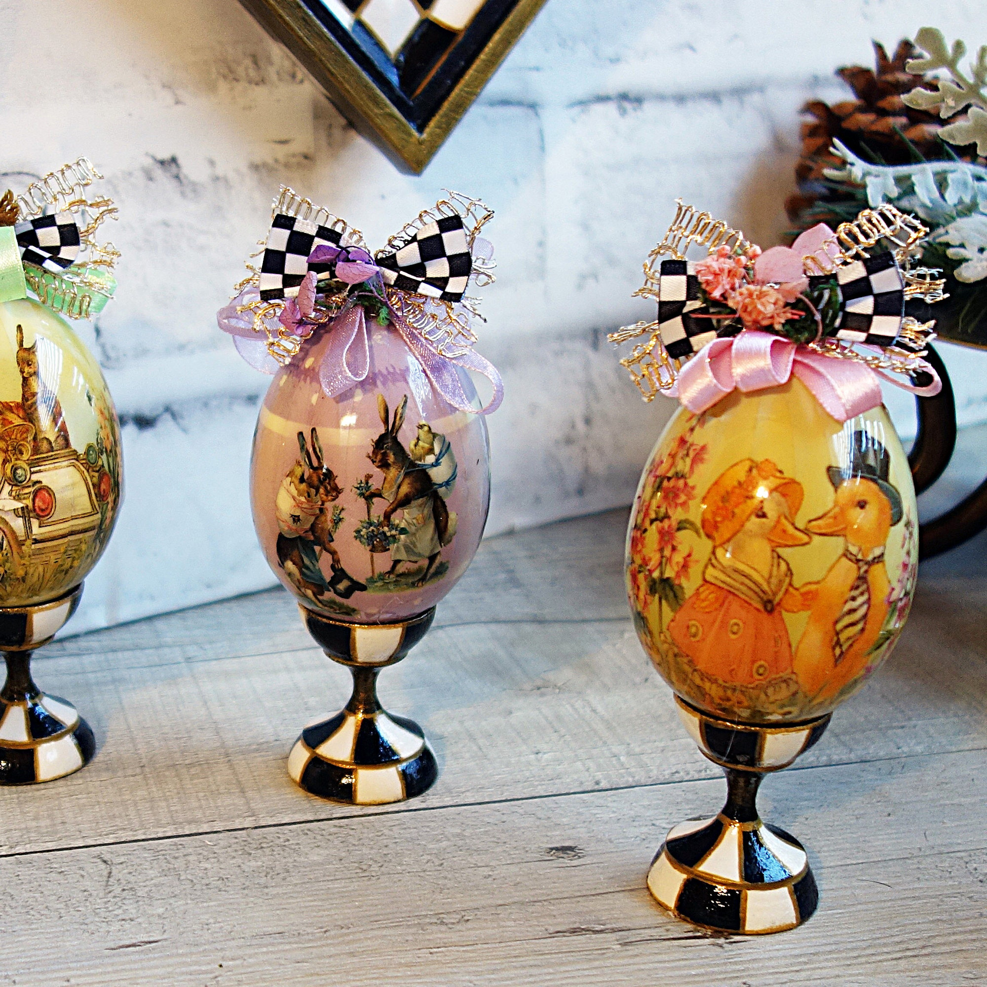 ARTISAN DETAILS These luxury vintage eggs are the star of the show with a high-gloss finish and crowned with custom ribbon work and delicate dried florals similar to traditional Ukrainian festive ribbon and floral Easter decorating, a nod to its wood stand. Each Ukrainian wood stand was hand-painted with a precision checkered motif to provide a modern anchor for the vintage eggs.