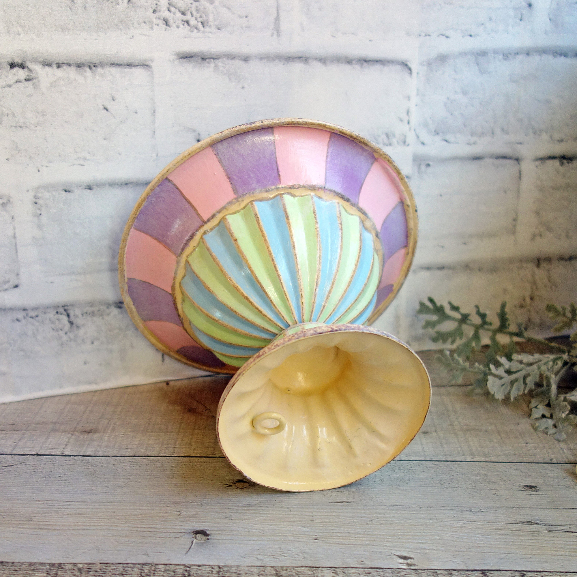 This MacKenzie inspired hand painted compote gives a nod to the original vintage artist, MacKenzie Childs, style and design with her pastel palette featured in her most earliest work. This caddy will make a truly whimsical and vibrant addition to your vintage courtly collection and home décor, offering a touch of playful elegance with its throwback style. Meticulously hand finished on durable metal, this pedestal dish features a delicate pastel palette of mint green, soft lavender, sky blue, coral and pink. The piece showcases fluted vertical stripes crowned with the classic checkerboard pattern on the interior and base peak. Sealed for lasting beauty, making it both a functional and artistic statement. Measuring approximately 5 inches tall and 6 inches wide across the top, this decorative dish is the perfect size for countless display possibilities.
