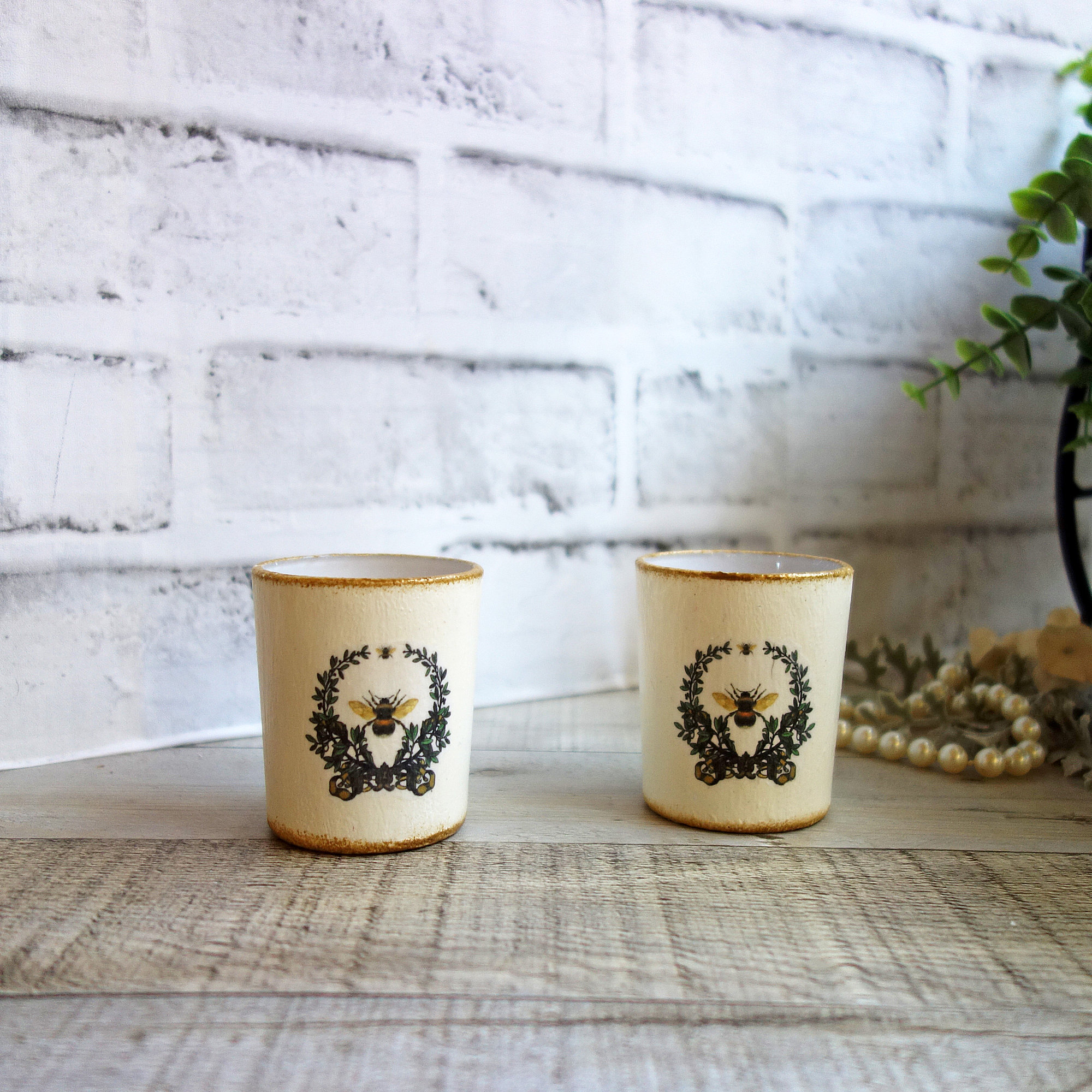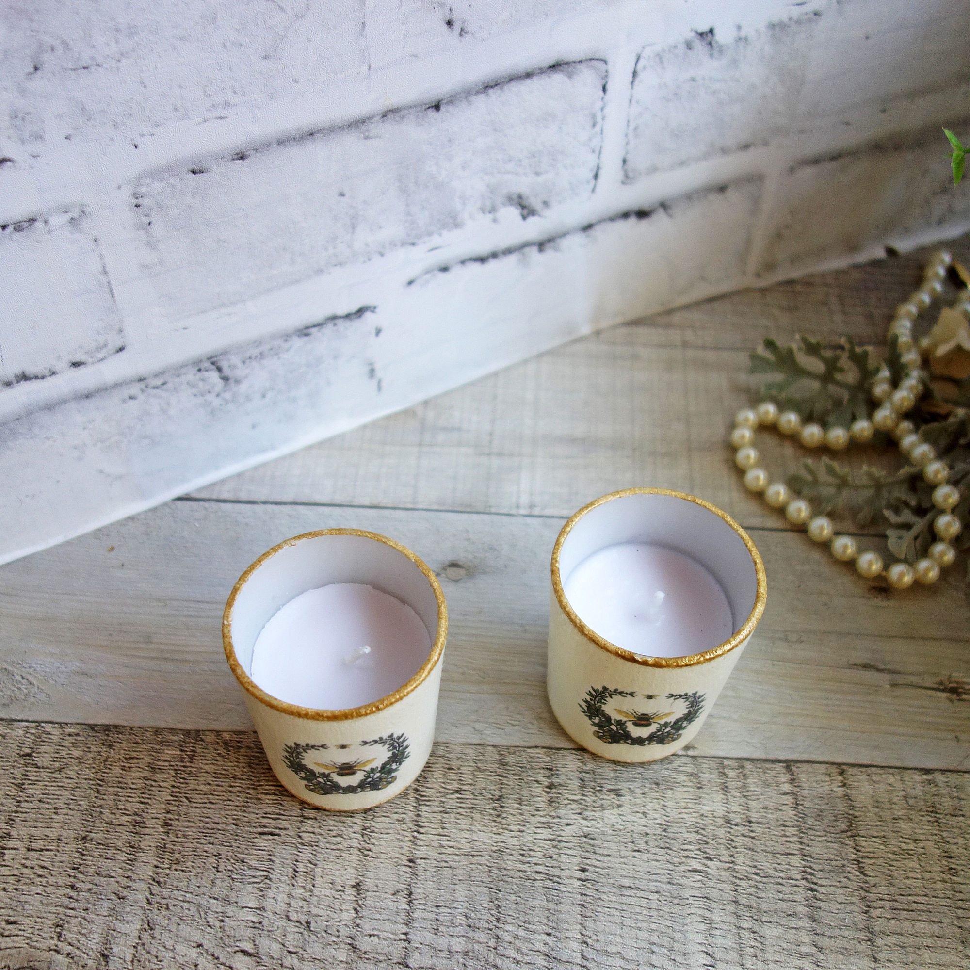 Bring a touch of vintage farmhouse charm and the industrious spirit of the honey bee into your home with this custom made set of two votive candles.